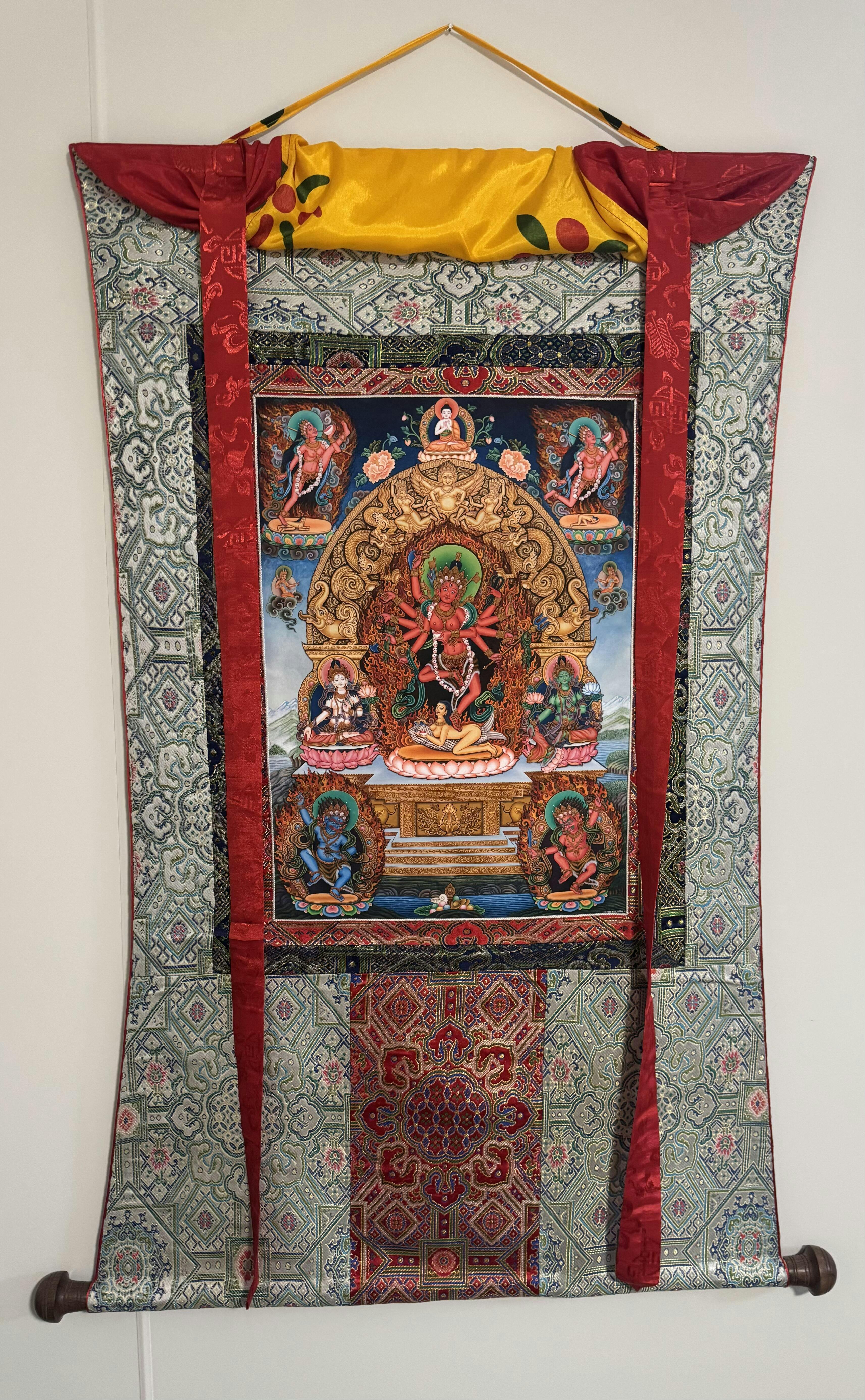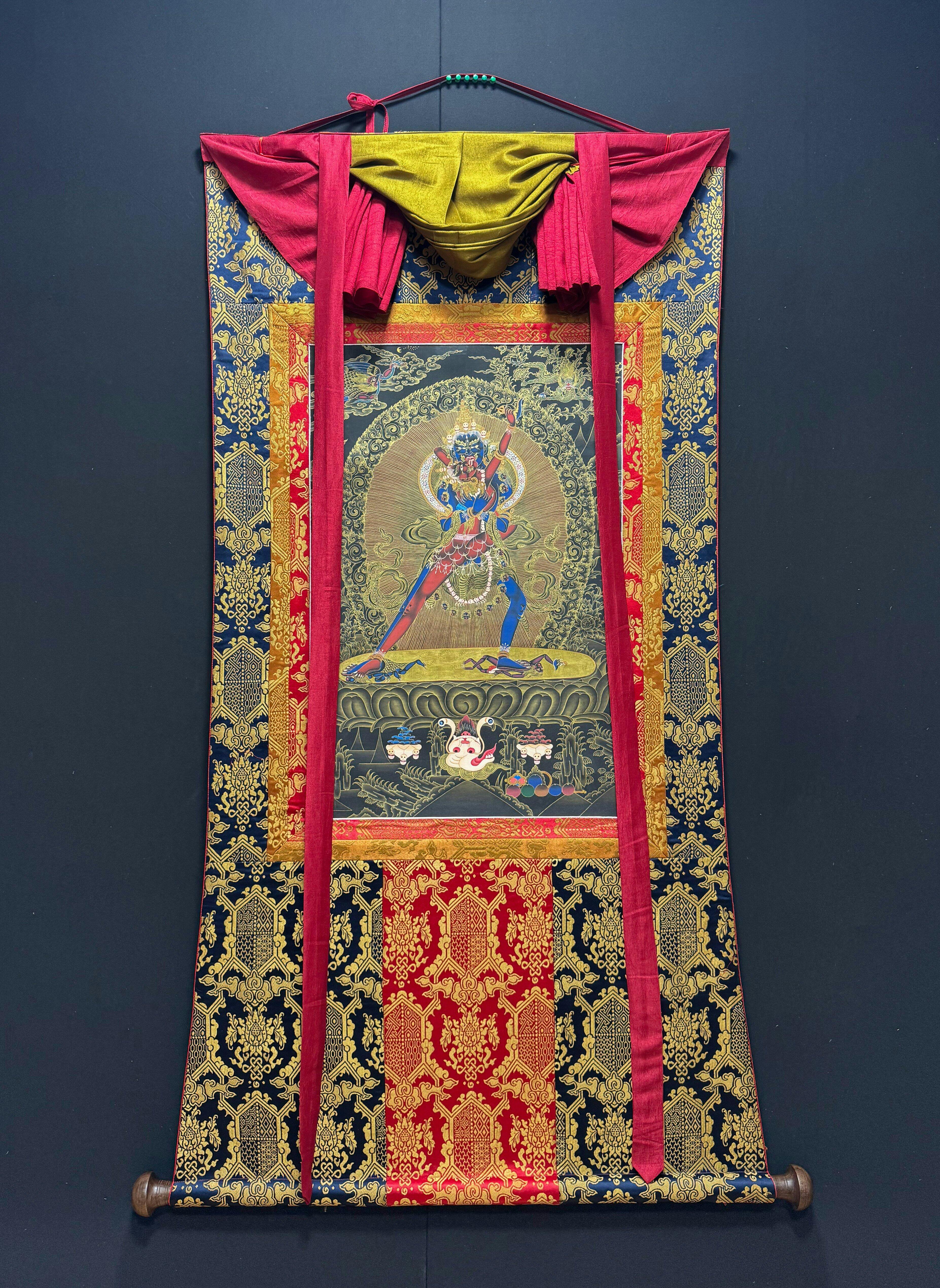 This Nakthang-style thangka depicts the Three Deities of Long Life—White Tara, Amitayus, and Namgyalma—with exquisite craftsmanship and traditional iconography. Crafted with authentic 24K gold on a black canvas, it radiates luminosity and spiritual transcendence. White Tara embodies compassion, Amitayus symbolizes vitality, and Namgyalma signifies enlightenment and purification. The black background enhances the gold details, creating depth and illumination. Hand-painted by a trained artist, this piece offers spiritual significance beyond aesthetic beauty, connecting to Buddhist tradition.
