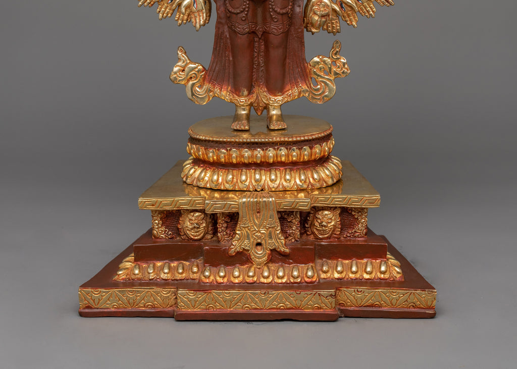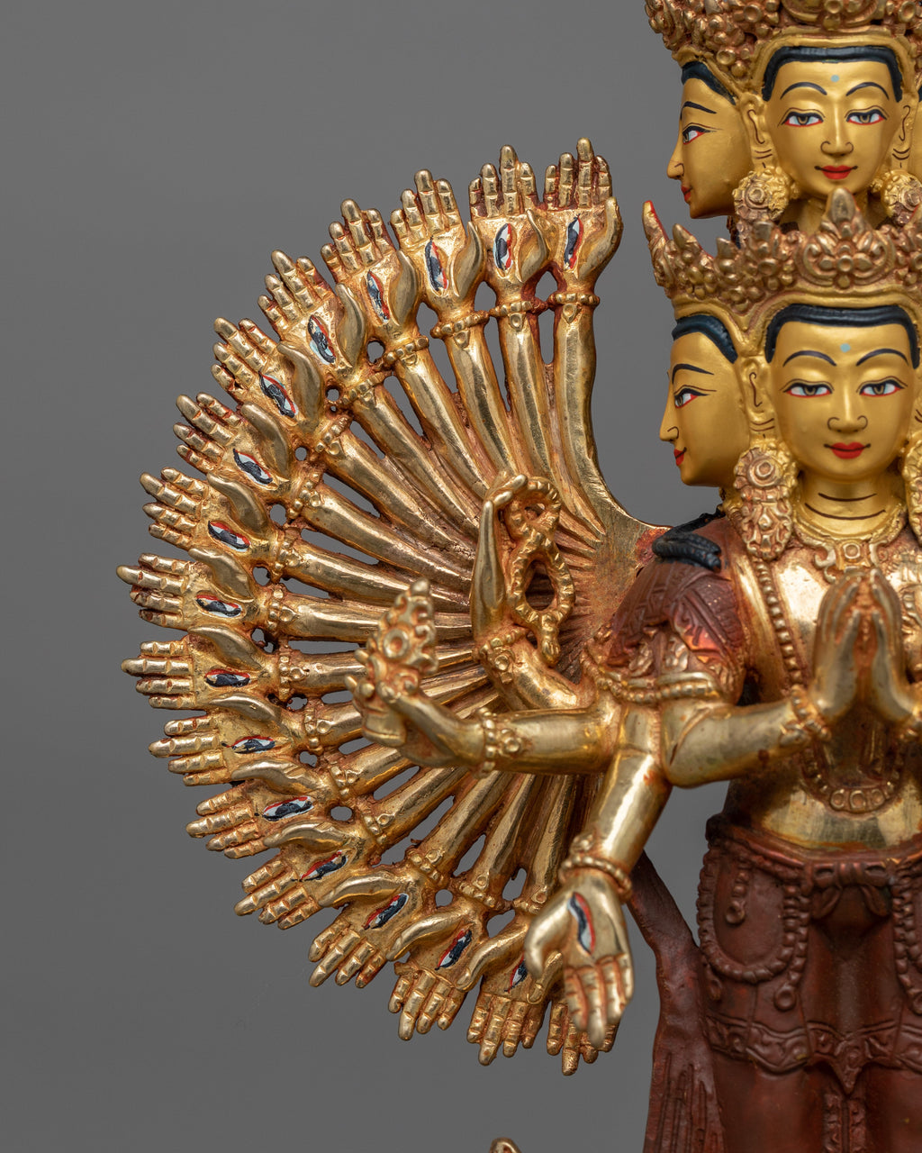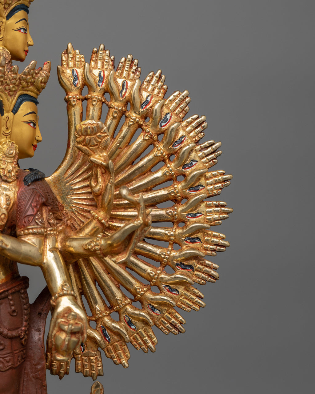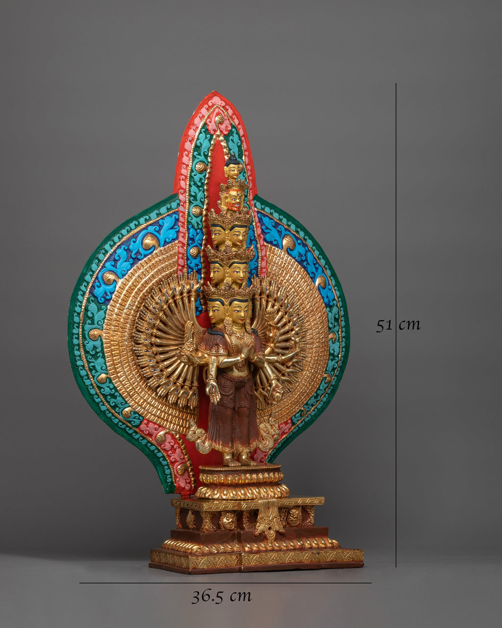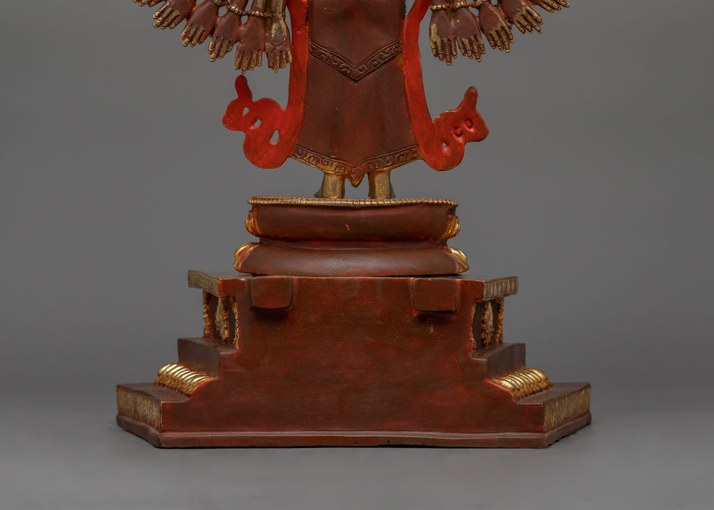 This 1000 Armed Chenrezig Deity stands at a height of 20.1 inches (51 cm) with a base measuring 14.4 inches (36.5 cm). Crafted from an oxidized copper body, the statue is adorned with 24K gold gilding and intricate gold and acrylic paintings, showcasing exceptional craftsmanship. Representing Avalokiteshvara, the Bodhisattva of Infinite Compassion, this piece embodies the essence of mercy, mindfulness, and spiritual awakening.
