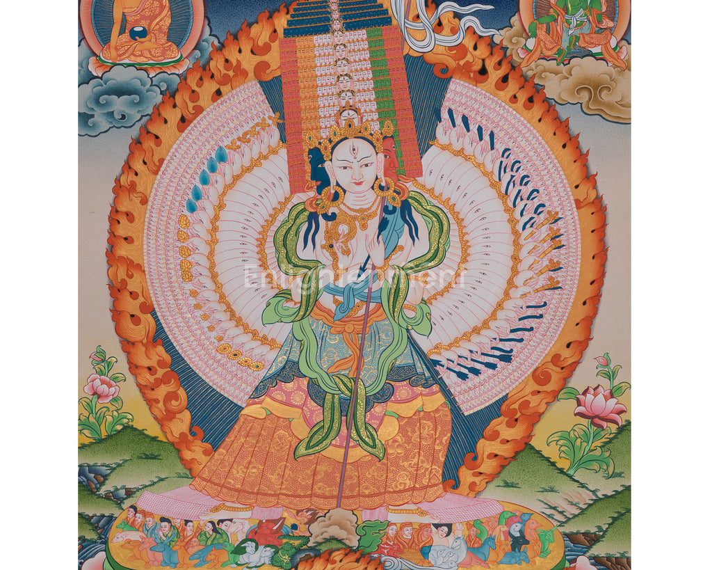 Hand-Painted 1000-Armed Dukkar | The White Umbrella Goddess | Featuring Shakyamuni Buddha and Green Tara