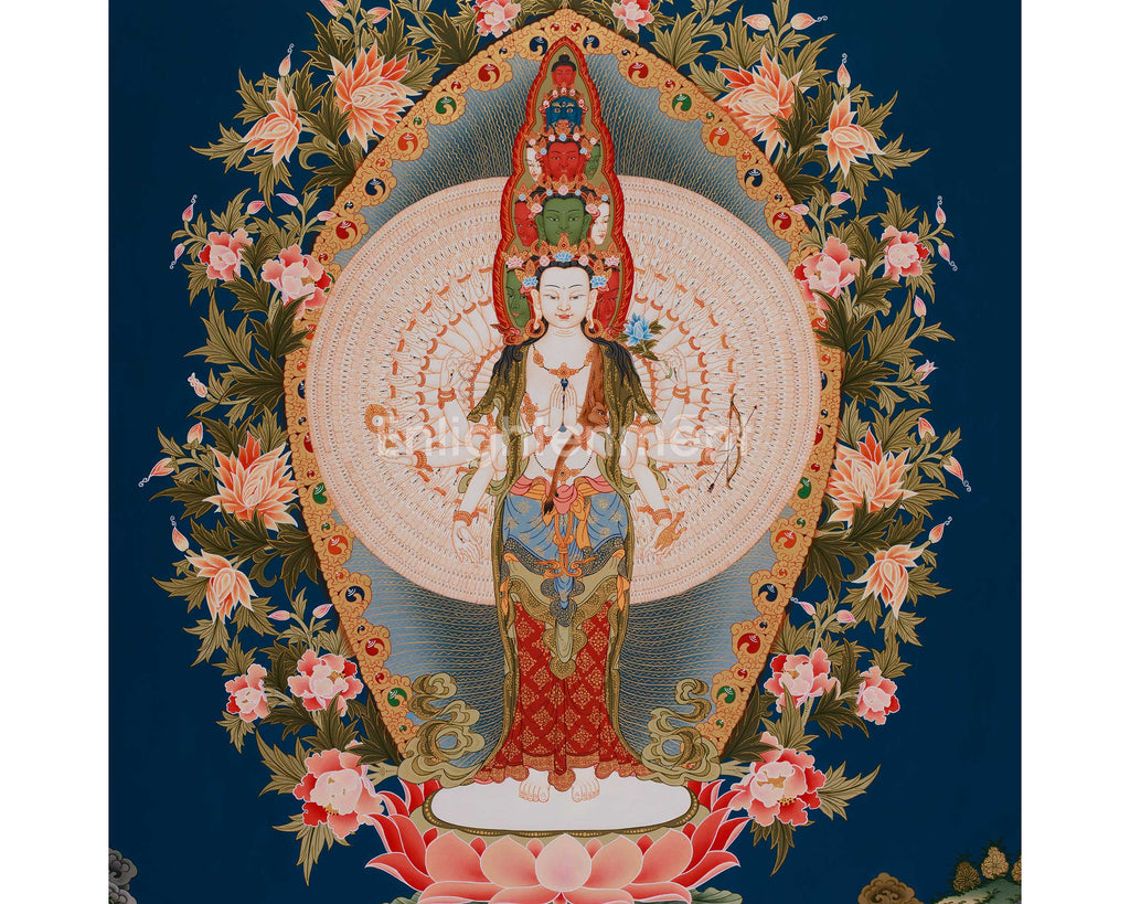 An impressive Avalokiteshvara Thangka (1000 Hands Buddha), a striking depiction of one of Mahayana Buddhism's most venerated bodhisattvas. The piece eloquently conveys Avalokiteshvara's core attributes, celebrated for his infinite compassion and wisdom, as his thousand arms extend towards those in need.