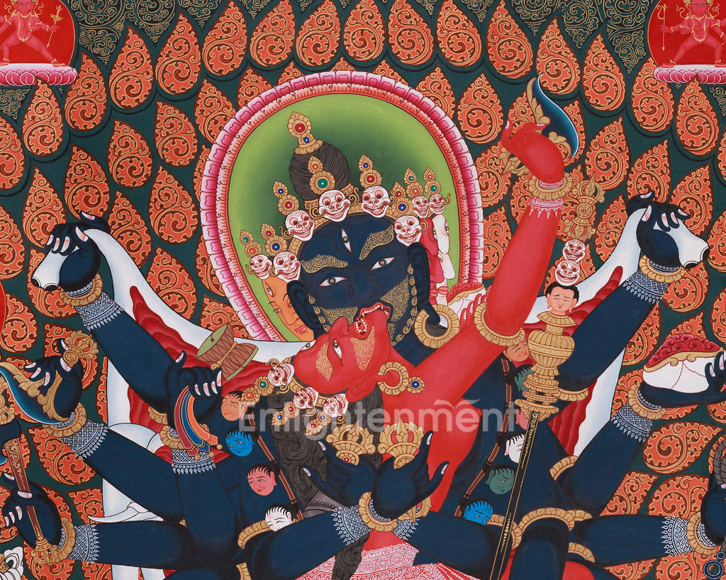 The 12-Armed Chakrasamvara Thangka is a visually captivating and spiritually potent depiction of the fierce and transformative deity. Hand-painted on premium cotton canvas using vibrant acrylic colors and enhanced with genuine 24K gold accents, this thangka radiates profound energy and spiritual significance. Created in the traditional style by a skilled Nepali artist, each intricate detail highlights the divine power and cosmic balance of Chakrasamvara, the deity who embodies the union of wisdom and compassion. The gold accents enhance the divine presence, while the rich color palette creates a dynamic and harmonious composition.