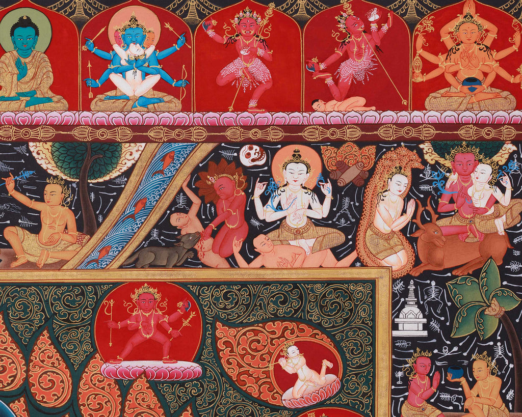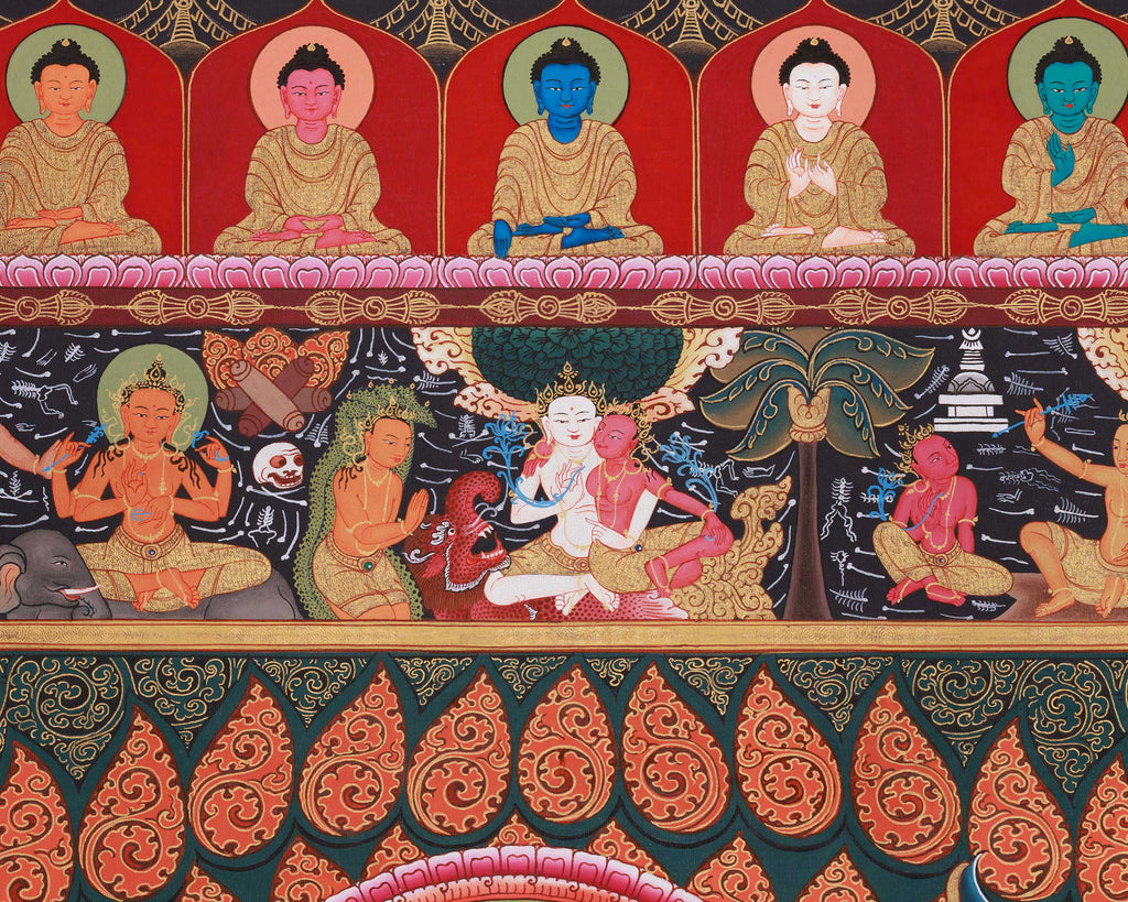 This thangka illustrates Chakrasamvara in his 12-armed form, symbolizing his capacity to act in all directions to protect and transform negative energies. His fierce stance highlights his protective role, using powerful mantras and sacred rituals to subdue harmful forces. Surrounding him are important deities, each contributing to themes of transformation and protection. Notably, Vajravarahi, his female consort, embodies wisdom and compassionate action. Mahakala, the protector deity, appears in the upper corners, emphasizing the mandala's strength and power. Additional deities, such as Dharma Protectors, Bodhisattvas, and Buddhas, are carefully positioned around Chakrasamvara, creating a balanced and potent environment that underscores protection, healing, and spiritual awakening. This thangka is perfect for meditation, healing, and those seeking to connect with Chakrasamvara’s fierce energy and wisdom, along with his divine entourage.