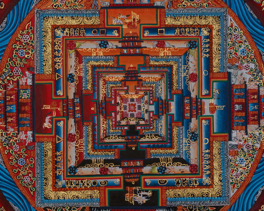 This concentric design showcases layers that illustrate various levels of spiritual growth. The center is encircled by geometric shapes and sacred symbols representing the universal forces of creation, preservation, and destruction. The colors and figures depict the four elements: earth, water, fire, and air, while mantras add a sacred dimension. The outer ring is adorned with vivid cloud patterns and lotus flowers, signifying purity and spiritual awakening. Each segment is rich in intricate details, inviting deeper contemplation and meditation. The Kalachakra Mandala serves as a tool for meditation and spiritual practice, fostering a connection with the universal flow of time and energy.