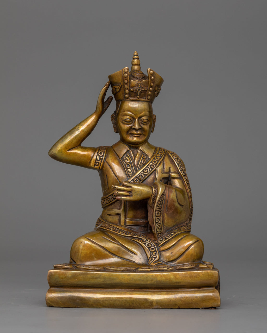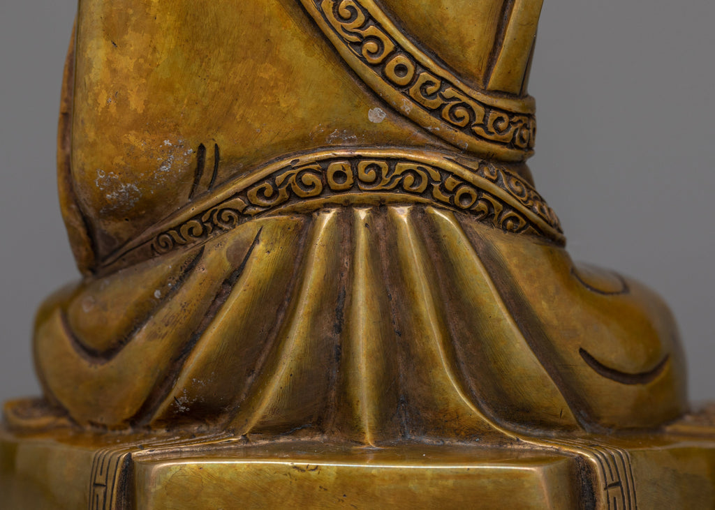 The statue honors Rangjung Rigpe Dorje's spiritual significance through a brilliant blend of traditional Tibetan imagery and careful craftsmanship. 16th Karmapa is deeply rooted in Tibetan Buddhist tradition, symbolizing his enlightened presence and persistent devotion to the Dharma. He is represented in a tranquil meditation pose, wearing decorated monastic robes engraved with beautiful patterns that represent his spiritual authority. His glance reflects knowledge and profound compassion, guiding practitioners to enlightenment. The oxidized copper finish adds depth to each engraving, expressing the essence of his timeless legacy.