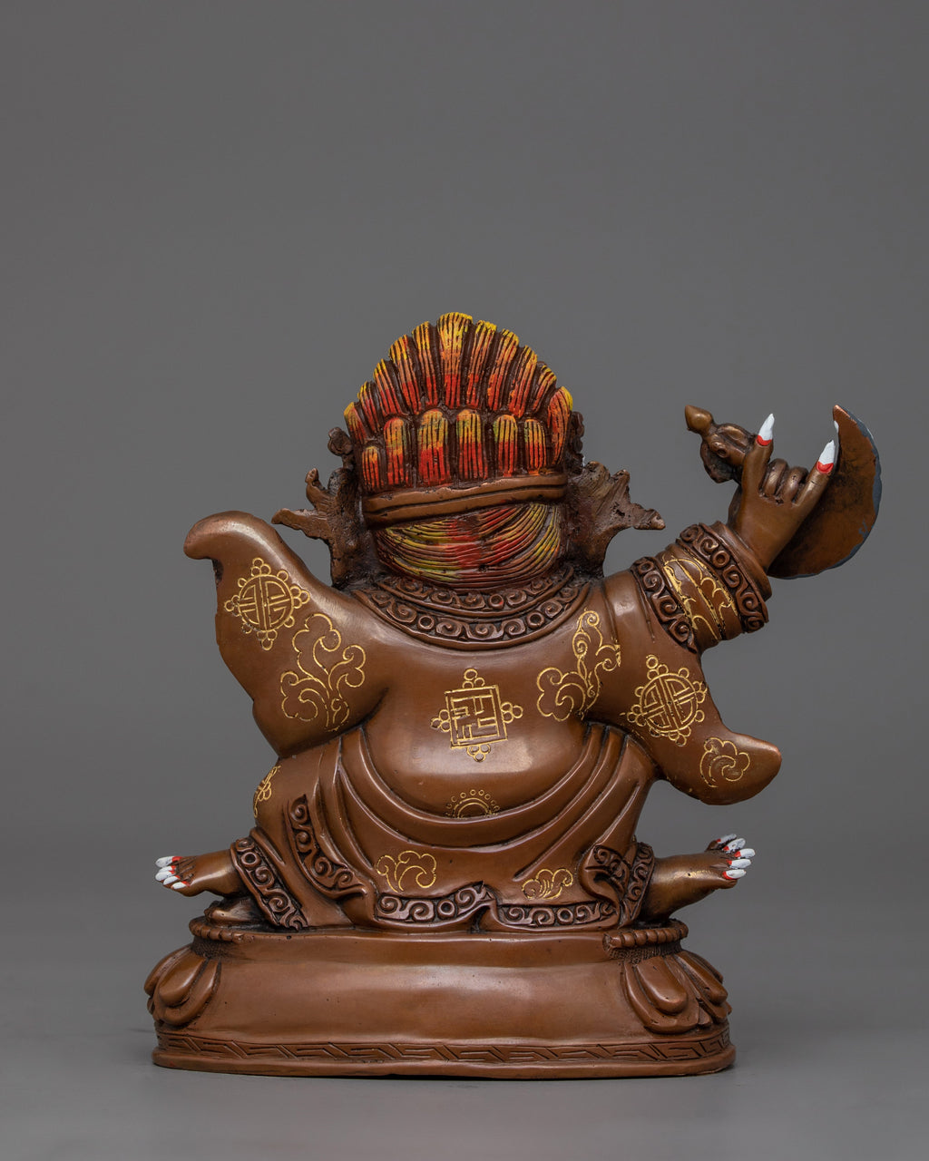 The sculpture's oxidized copper body gives it a distinct chocolate tone, producing a startling contrast that showcases Mahakala's fierce features. This oxidation process not only improves the aesthetic appeal of the piece but also represents the transforming character of Mahakala's protective force.
