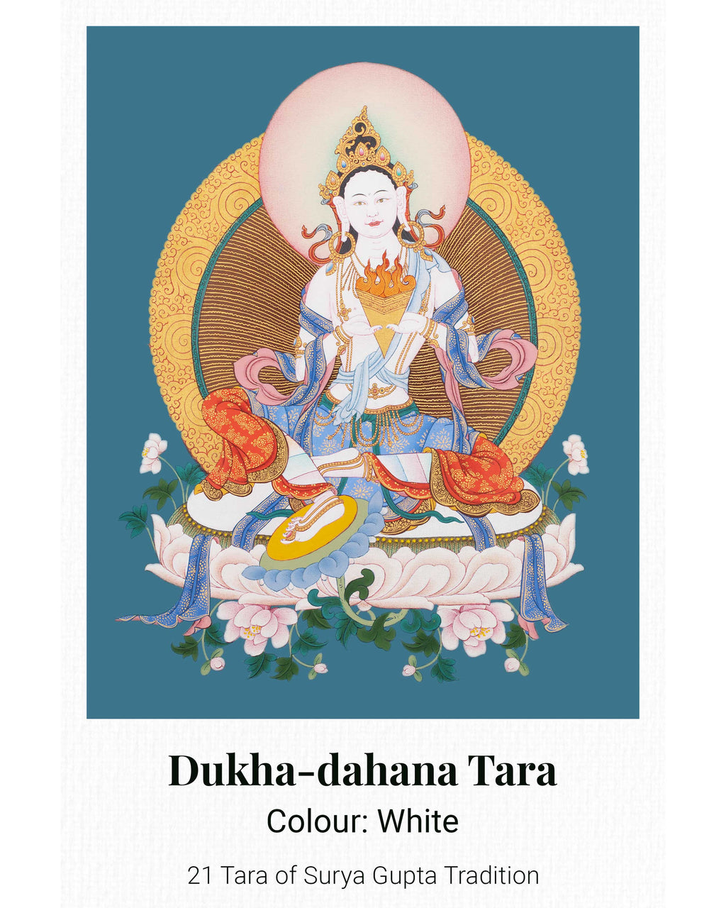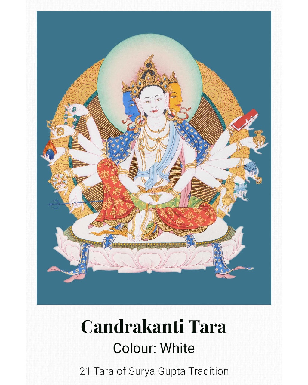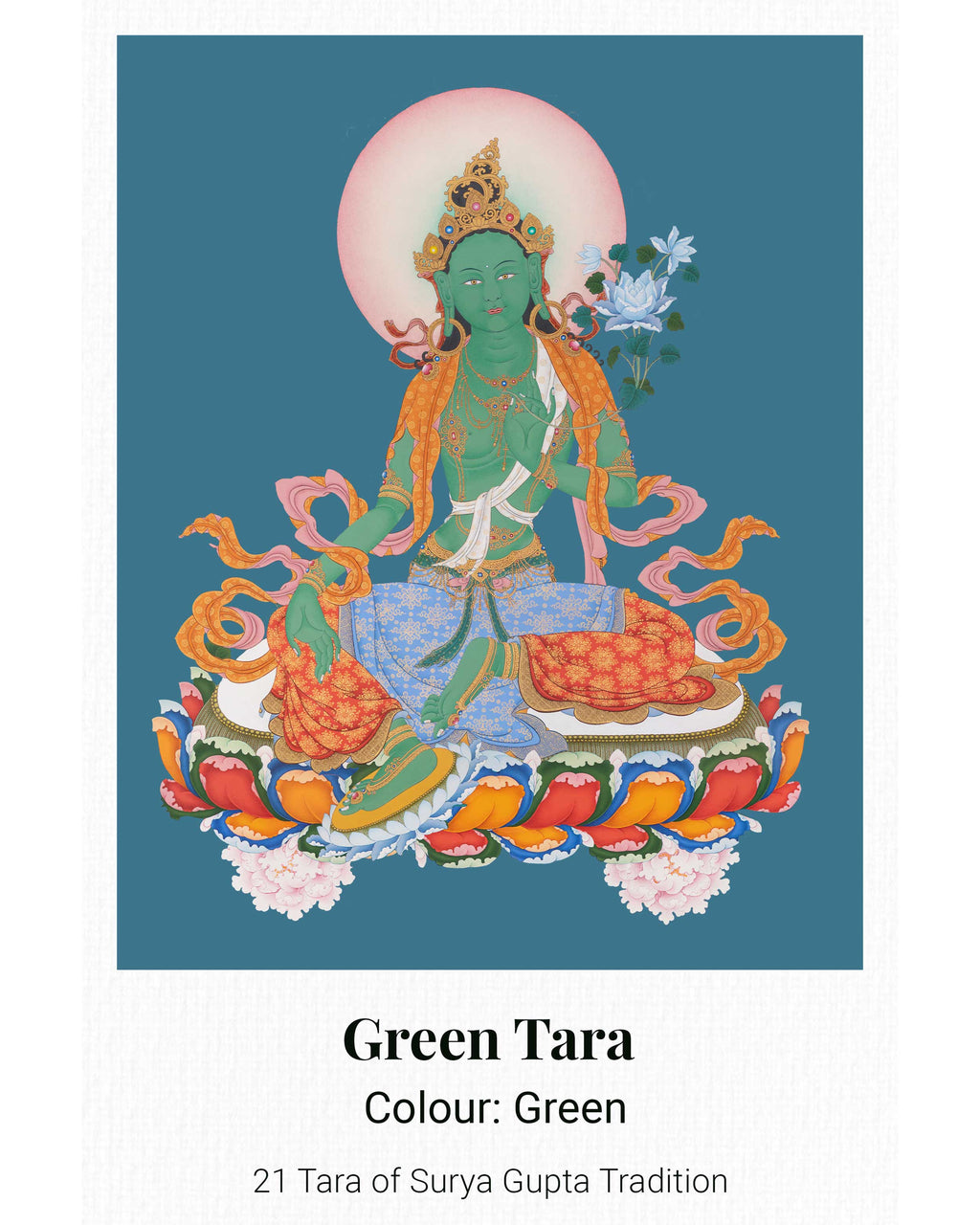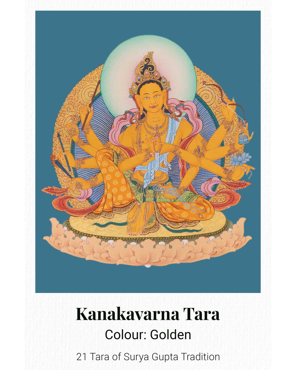 This 21 Tara Canvas Print is a high-quality thangka reproduction from the Maha Siddha Surya Gupta tradition, showcasing the intricate details, vibrant colors, and profound symbolism of the original artwork. Printed on sturdy canvas and customizable in size, it illustrates the many aspects of Tara, the female Bodhisattva representing compassion, wisdom, and protection. Ideal for meditation rooms, personal altars, or spiritual collections, this print functions as a devotional image and a meaningful spiritual aid.