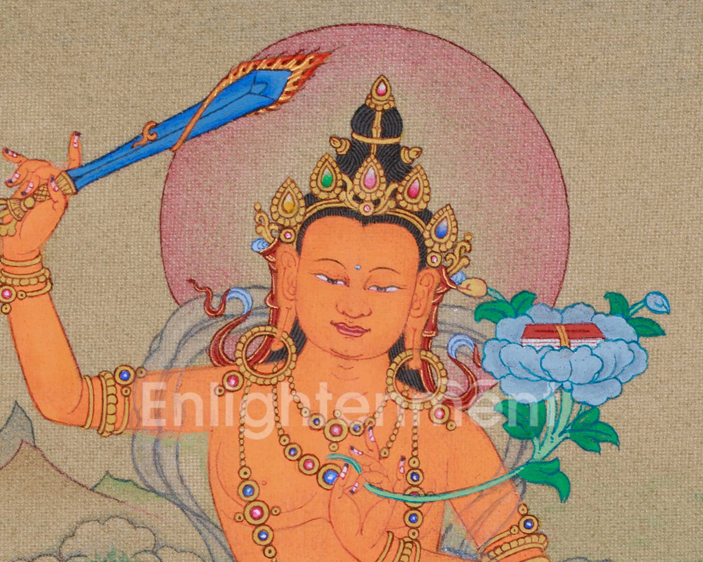 The 23 cm Manjushri Thangka, a hand-painted artwork, was created in our Enlightenment Studio. Made on fine cotton canvas with natural stone colors and genuine 24K gold, this thangka radiates both spiritual energy and artistic elegance. The mineral pigments provide vibrant, long-lasting color, while the gold detailing highlights Manjushri’s divine presence, symbolizing wisdom and insight. Executed in the traditional Karma Gadri style, known for its fine detailing, harmonious composition, and serene aesthetics, this artwork is a perfect blend of devotion, workmanship, and sacred symbolism.