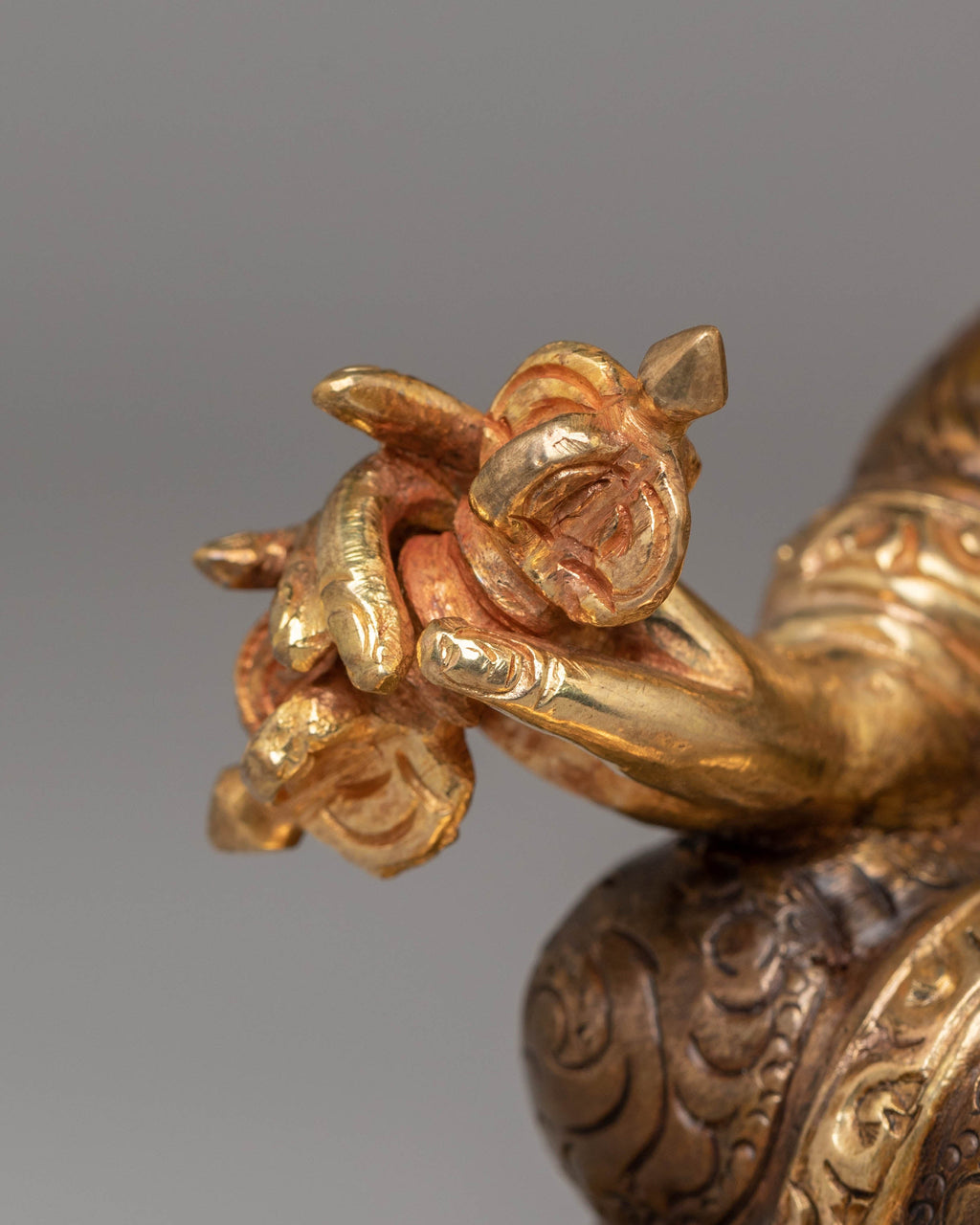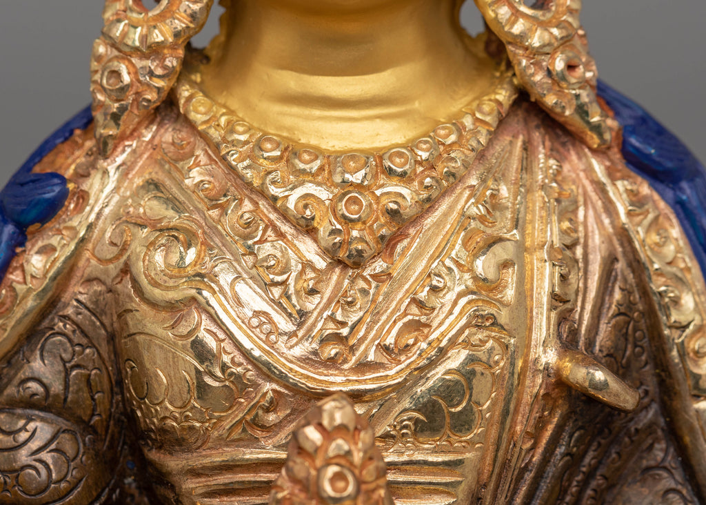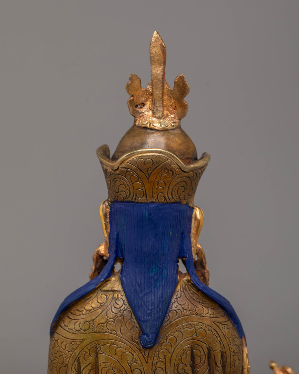 The 24k Gold-Glided Statue of Guru Rinpoche is a beautiful spiritual work depicting Guru Rinpoche, a respected figure in Tibetan Buddhism known for his wisdom, power, and compassion. Standing 23 cm tall, with a 16 cm base and weighing 1.31 kg, this statue is made of copper and includes 24k gold filigree, which adds elegance and divine brightness to the form. The statue's superb design highlights the intricate qualities of Guru Rinpoche's outfit and features, transforming it into a powerful symbol of spiritual guidance and enlightenment. This magnificent statue is ideal for any Buddhist shrine, meditation room, or as a holy gift for anyone seeking blessings and heavenly protection.