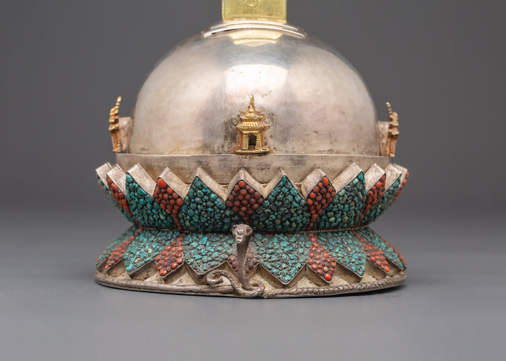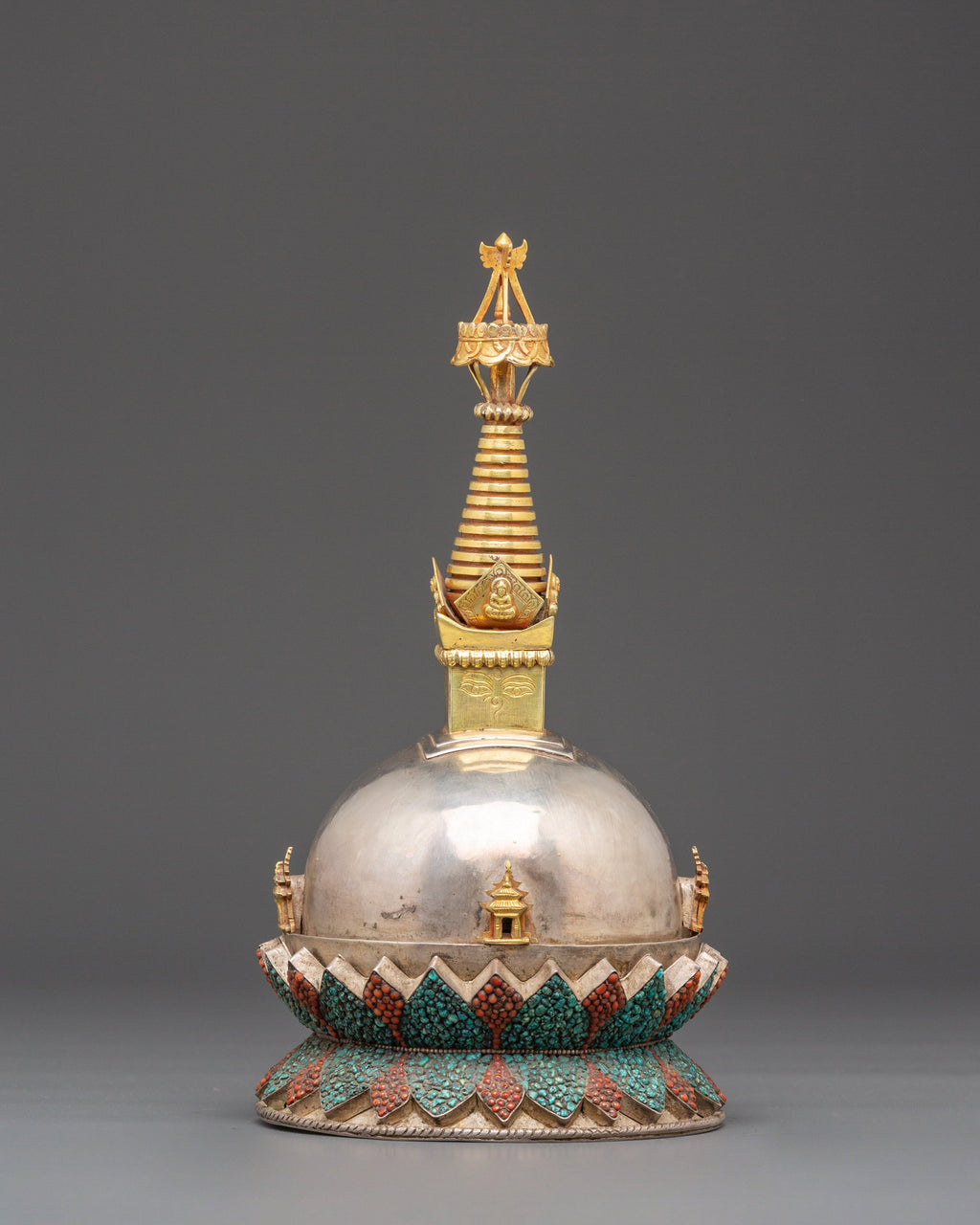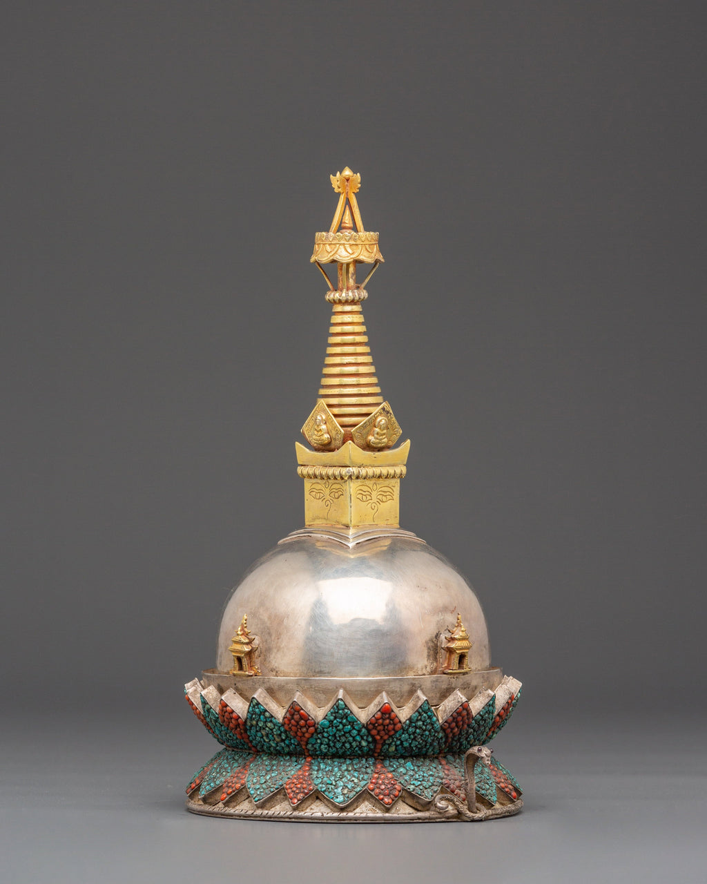 This stupa, made of pure silver with 24k gold plating, is embellished with authentic turquoise and coral stones, each having a symbolic meaning—turquoise for spiritual healing, coral for vigor and life force. The lotus petal design at the base denotes purity, while the golden spire depicts the stages of enlightenment. This stupa stands out for its openable lid from the top joint, which allows sacred relics, mantras, or offerings to be placed within, boosting its significance as a real ritual vessel.
