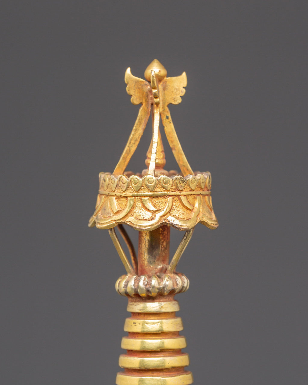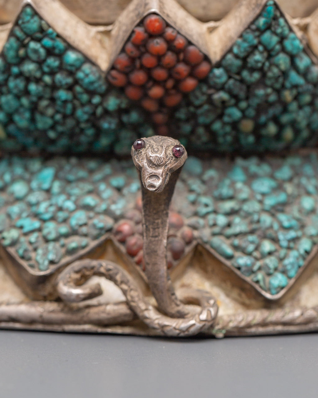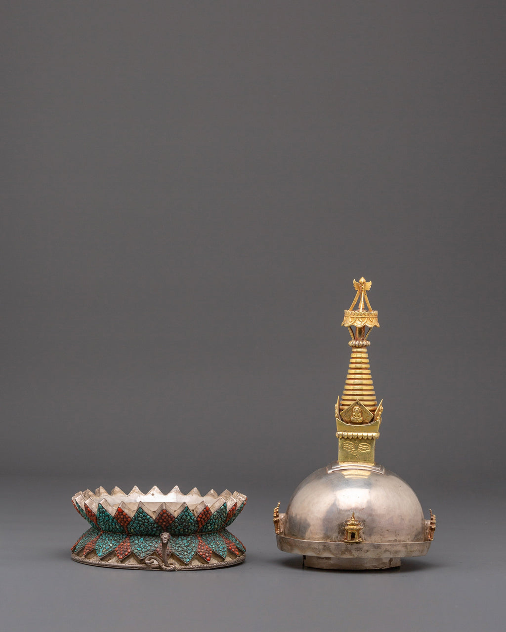 This stupa, made of pure silver with 24k gold plating, is embellished with authentic turquoise and coral stones, each having a symbolic meaning—turquoise for spiritual healing, coral for vigor and life force. The lotus petal design at the base denotes purity, while the golden spire depicts the stages of enlightenment. This stupa stands out for its openable lid from the top joint, which allows sacred relics, mantras, or offerings to be placed within, boosting its significance as a real ritual vessel.