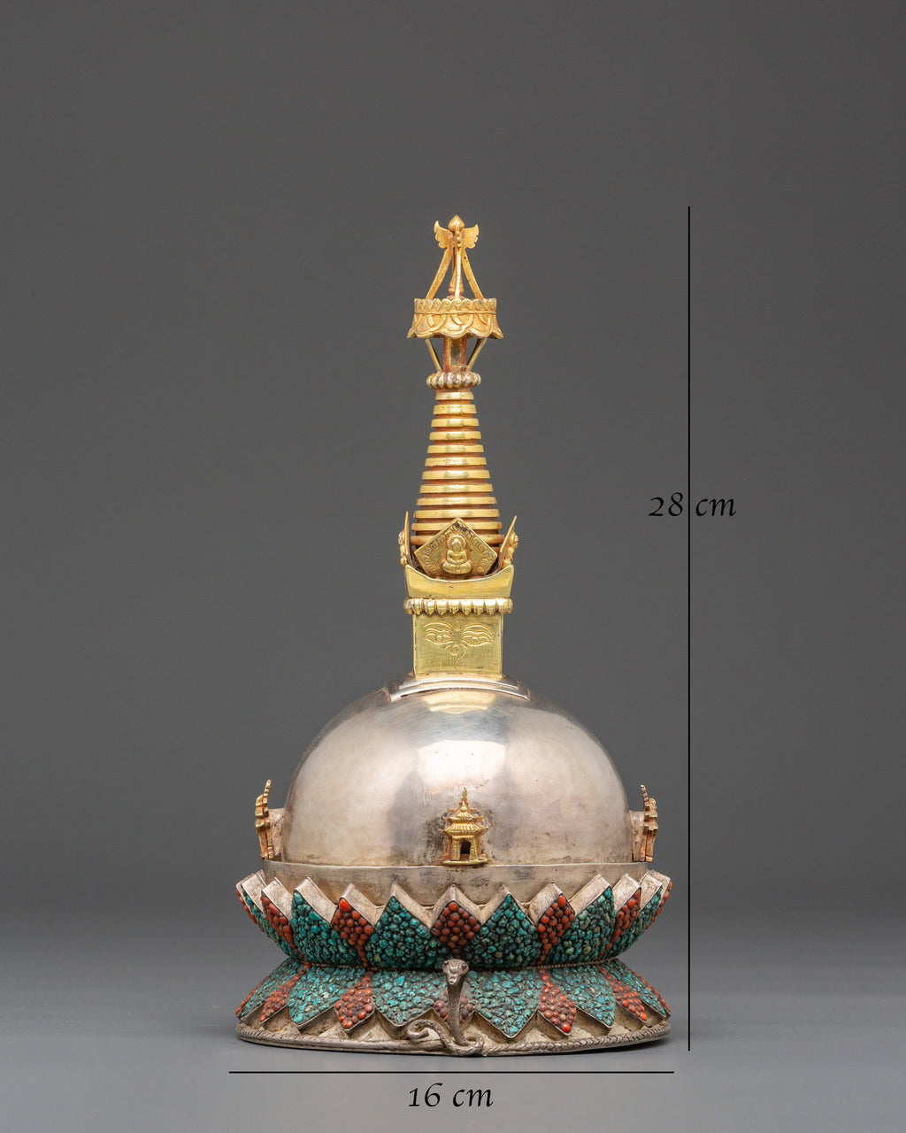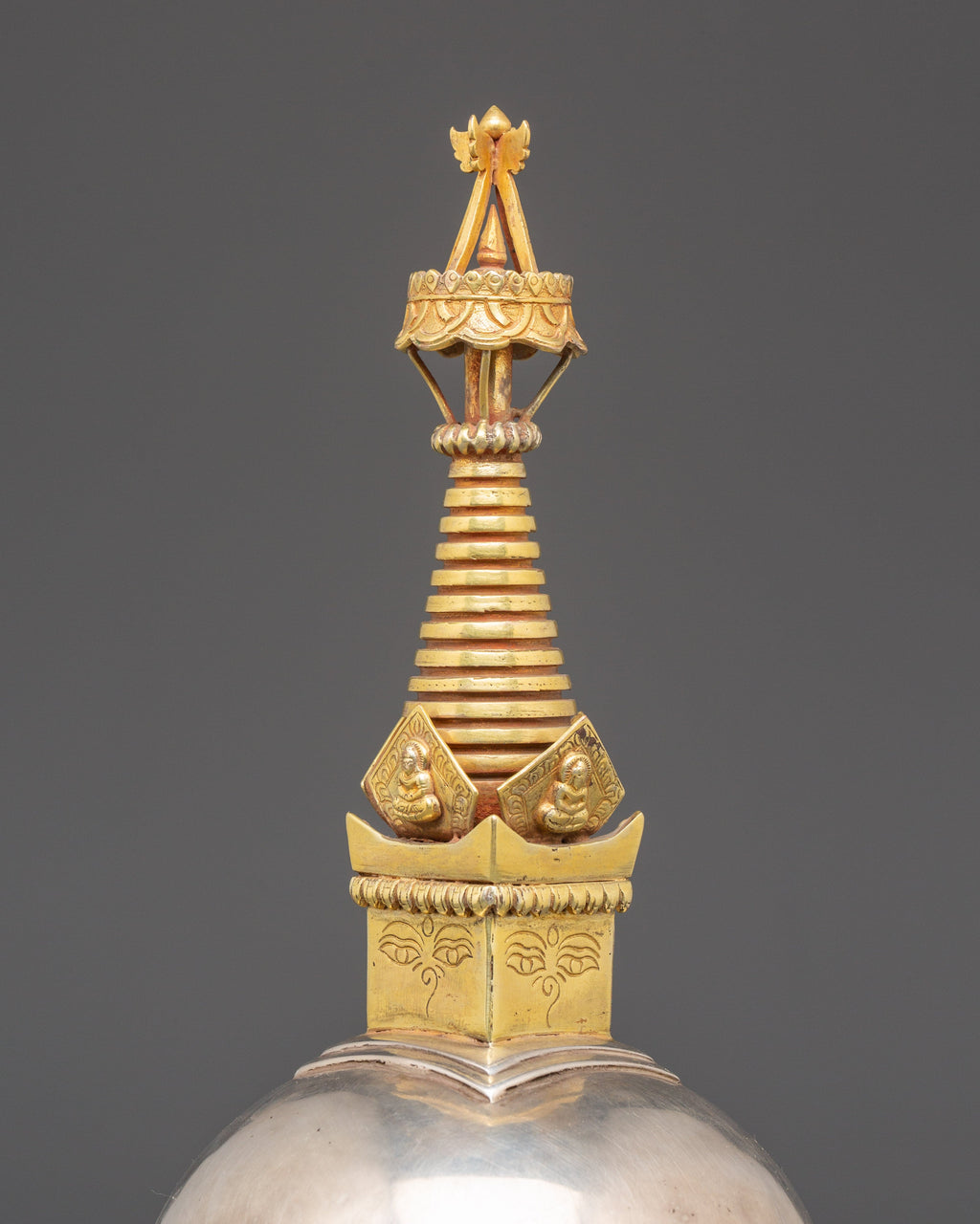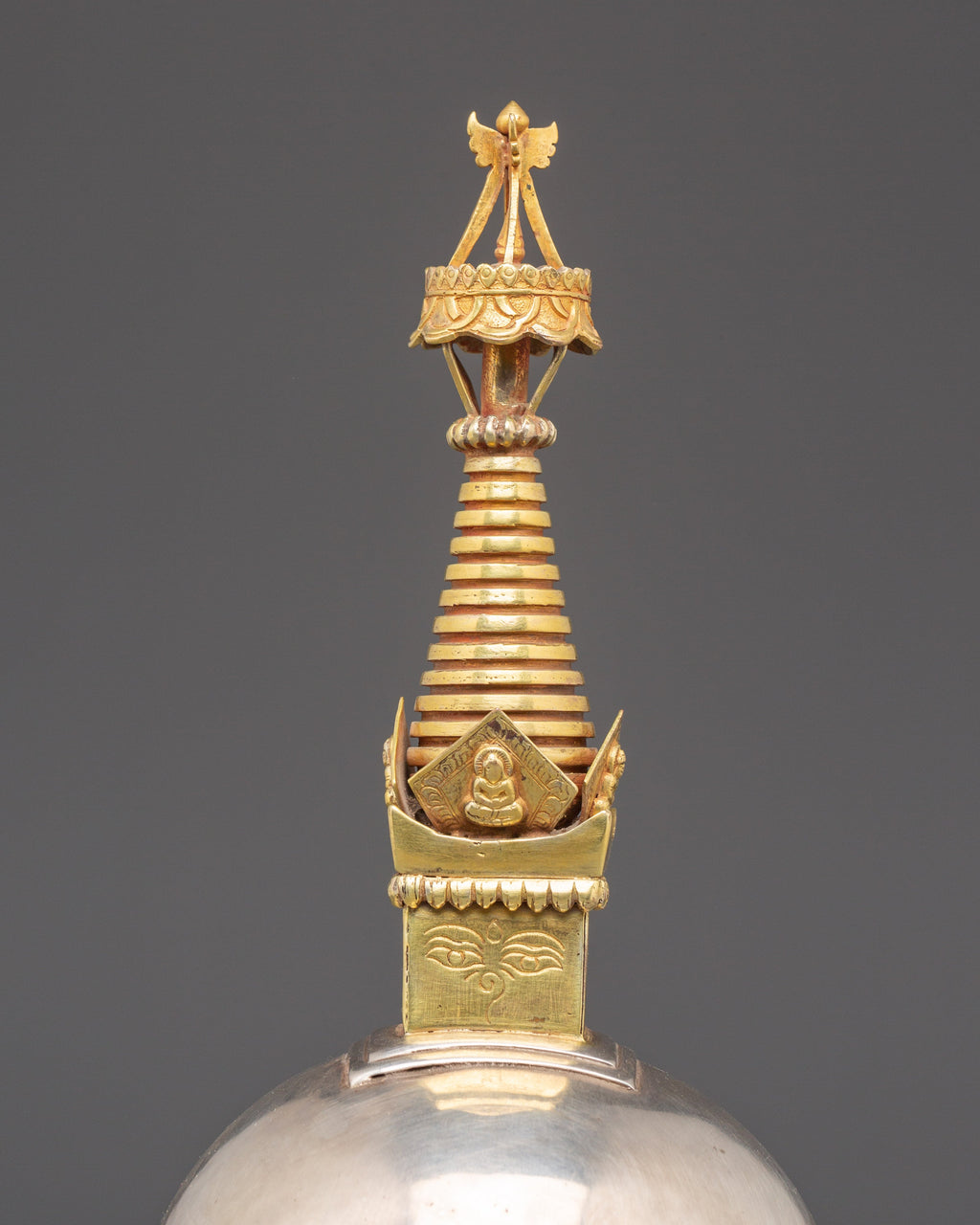 This Tibetan Buddhist stupa is a spiritual treasure, perfect for practitioners, collectors, and holy spaces. It is used in ceremonial ceremonies, as an altar centerpiece, or as a symbolic container for relics and blessings, and represents harmony, protection, and spiritual energy. This silver and gold-plated stupa combines artistry with deep spiritual meaning, making it a lasting piece of Buddhist heritage that inspires devotion and inner serenity.