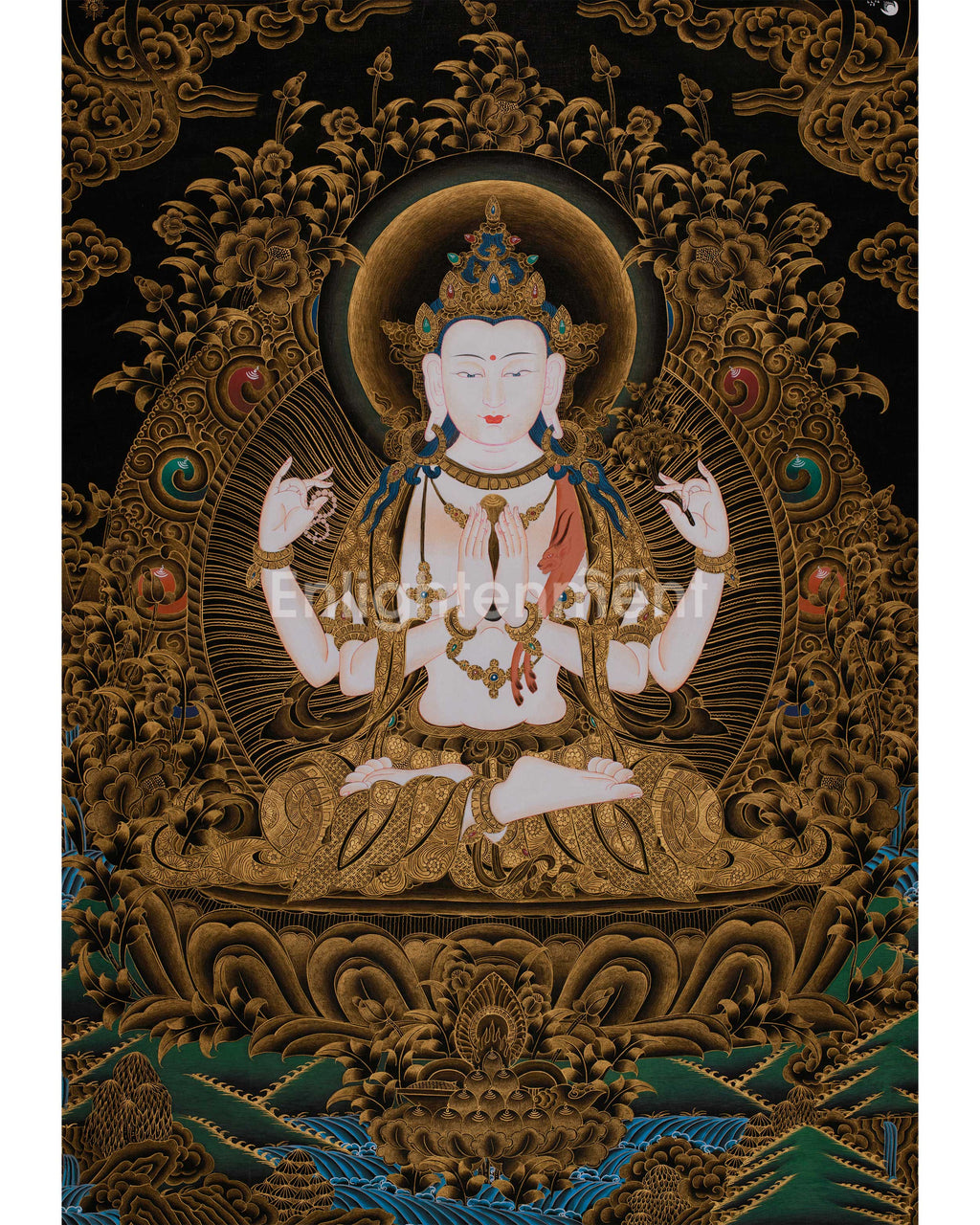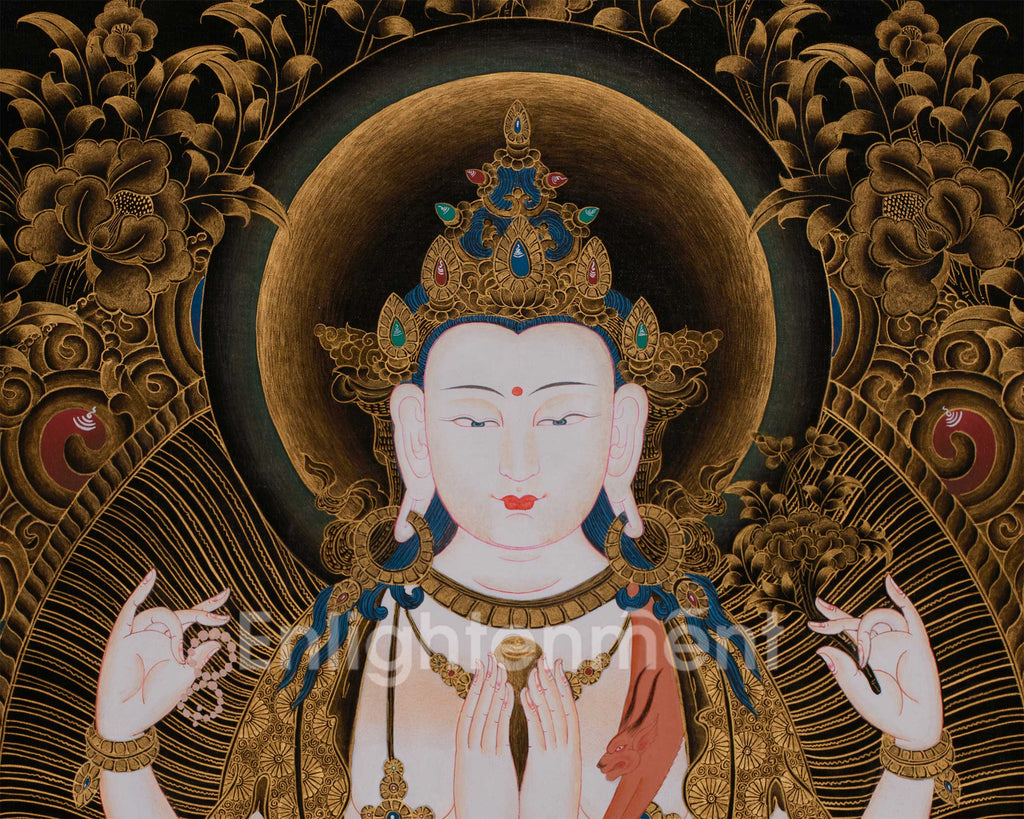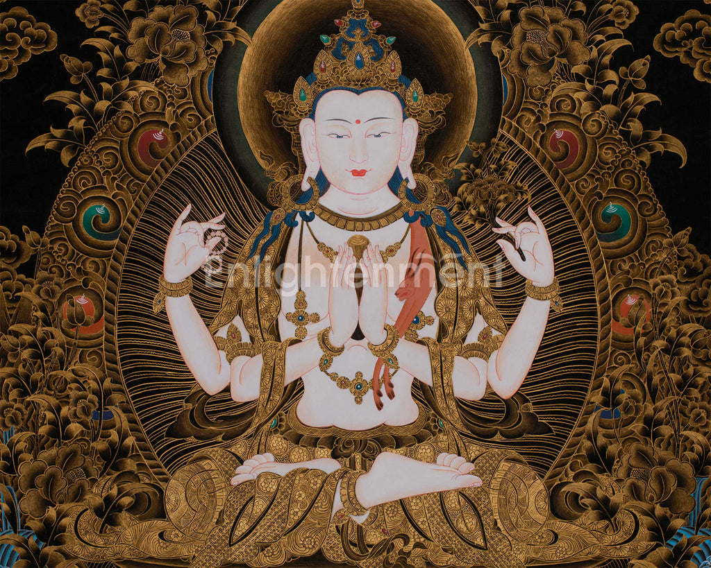 The 30-inch Chenrezig thangka showcases the Four-Armed Avalokiteshvara intricately depicted on black cotton canvas. The deity's body is hand-painted in fine acrylic colors, offering a soft, luminous tone that contrasts beautifully with the lavish surroundings enriched with genuine 24K gold. Every element, such as ornaments, garments, lotus seats, and sacred motifs, is gracefully adorned in gold, creating an aura of spiritual elegance and sacred opulence.