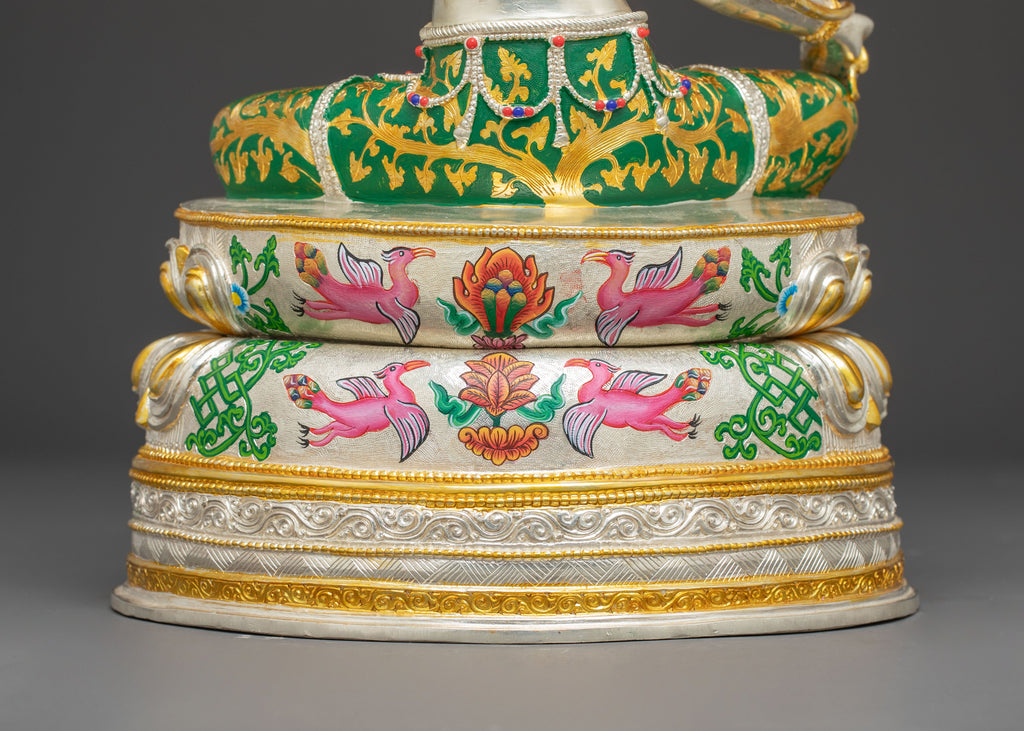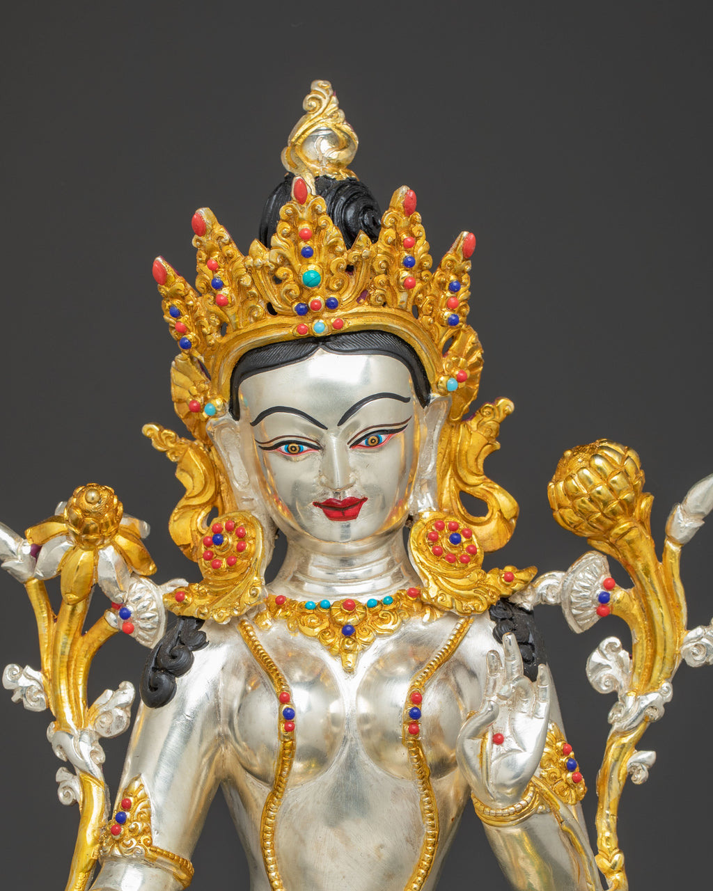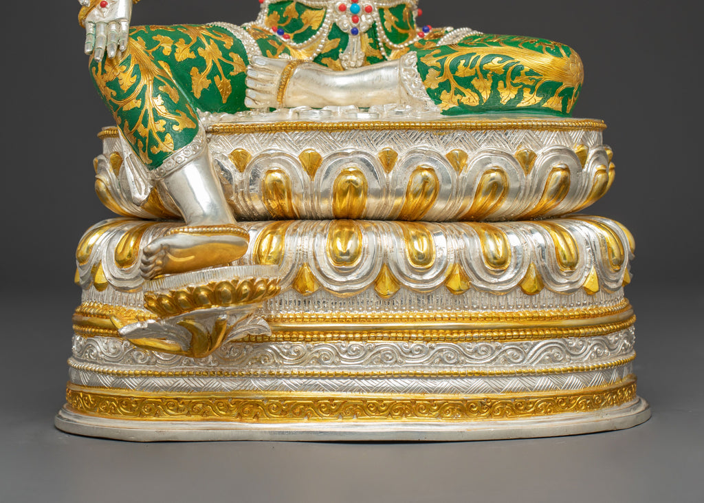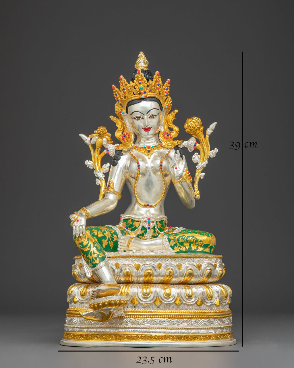 This 39cm Green Tara Statue is a stunning example of compassion, wisdom, and divine beauty. Standing 39cm tall, 23.5cm wide, and weighing 4.62kg, this enormous work oozes spiritual majesty. It is expertly handcrafted from copper and plated with silver and gold, creating a radiant luminosity that reflects Tara's enlightened nature. The artisan's exquisite attention to detail is evident in the soft contours of her face, the elaborate jewelry, and the delicately sculpted lotus seat. The statue's delicate painting in acrylic hues gives depth and warmth, while the shimmering surface adds to the visual harmony of this sacred figure.