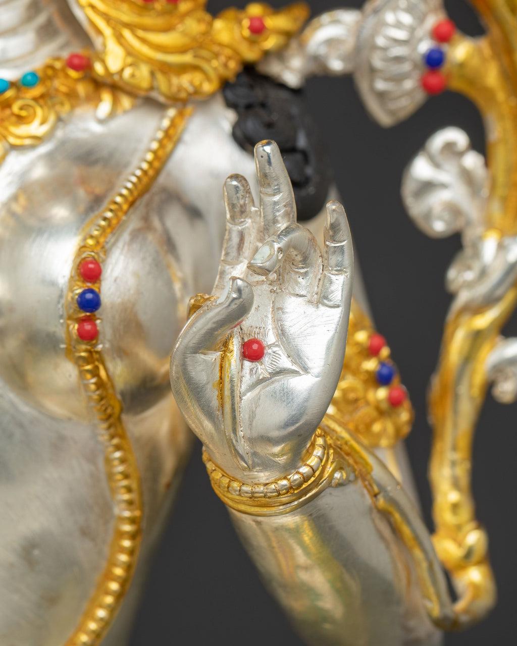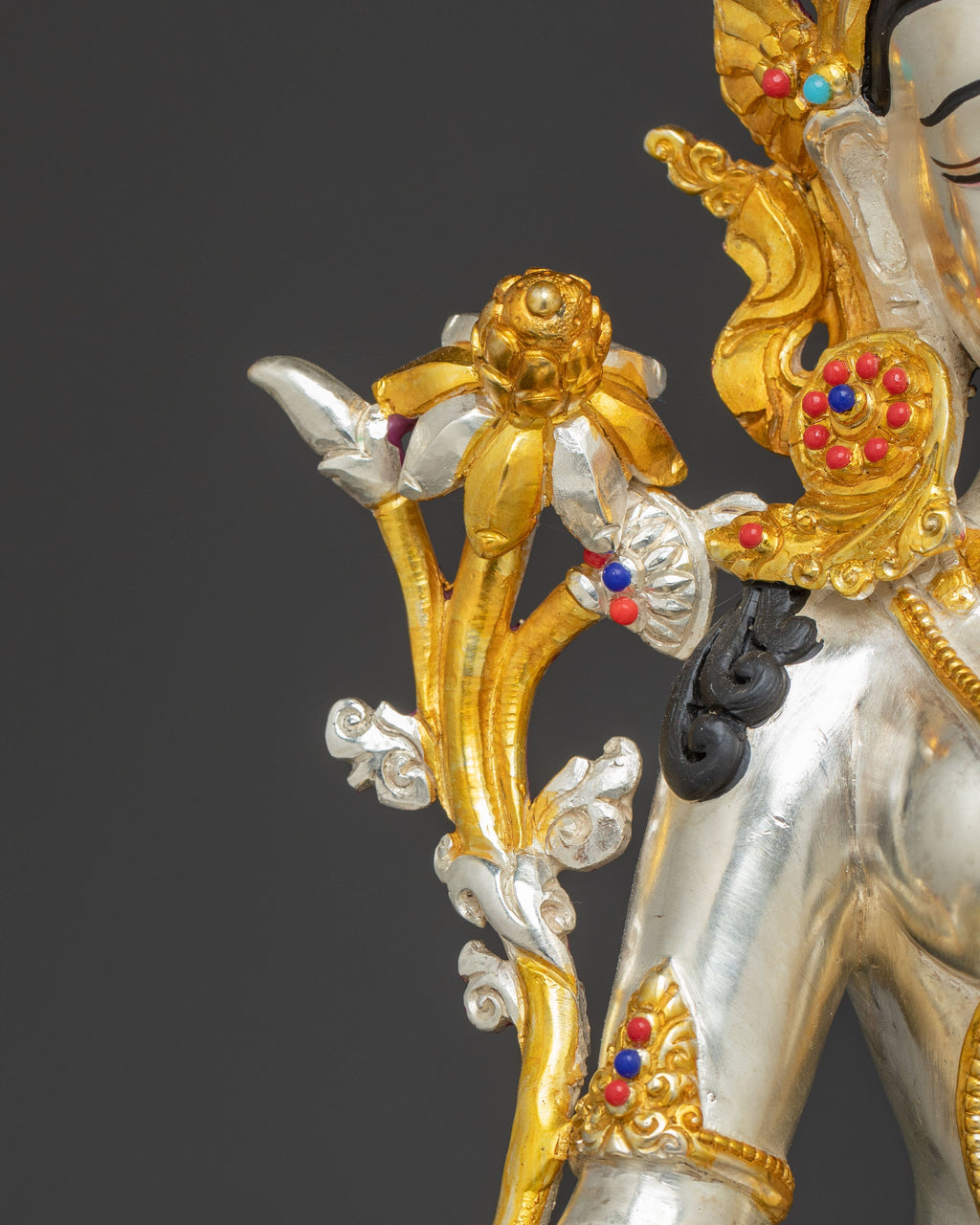 The use of artificial stones (Lapis Lazuli, Turquoise, and Coral) adds symbolic meaning and a colorful contrast to the sculpture. Lapis Lazuli indicates inner calm and spiritual insight, turquoise protects and heals, while coral represents life force and compassion. Together, these stones enhance the Tibetan Green Tara's mystical aura, transforming it from a statue to a work of devotion and spiritual craftsmanship. Every detail, from the folds of her robe to the growing lotus underneath her, exemplifies the outstanding craftsmanship of the Himalayan heritage.