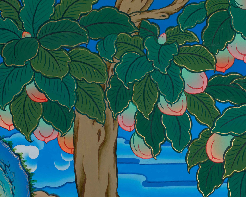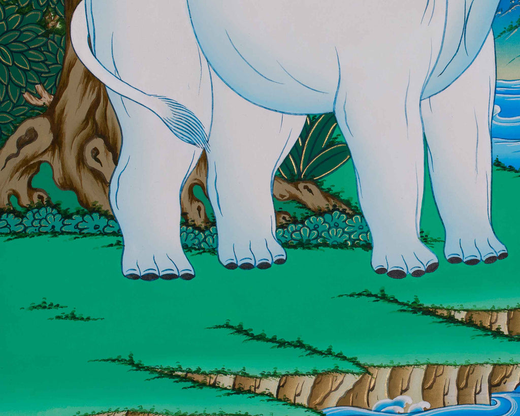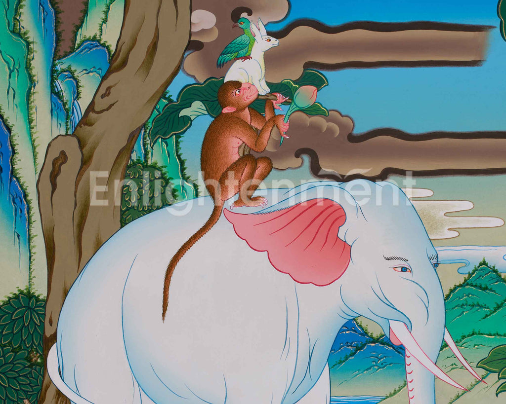 This thangka presents a compelling allegory of mutual support and respect. It features animals—a gentle elephant, a playful monkey, a wise rabbit, and a bird—cooperating with one another, each embodying a key Buddhist virtue. The elephant symbolizes strength and stability, the monkey agility and cleverness, the rabbit humility and quickness, and the bird awareness and freedom. Collectively, they highlight the interconnectedness of all beings and the importance of collaboration for the greater good.