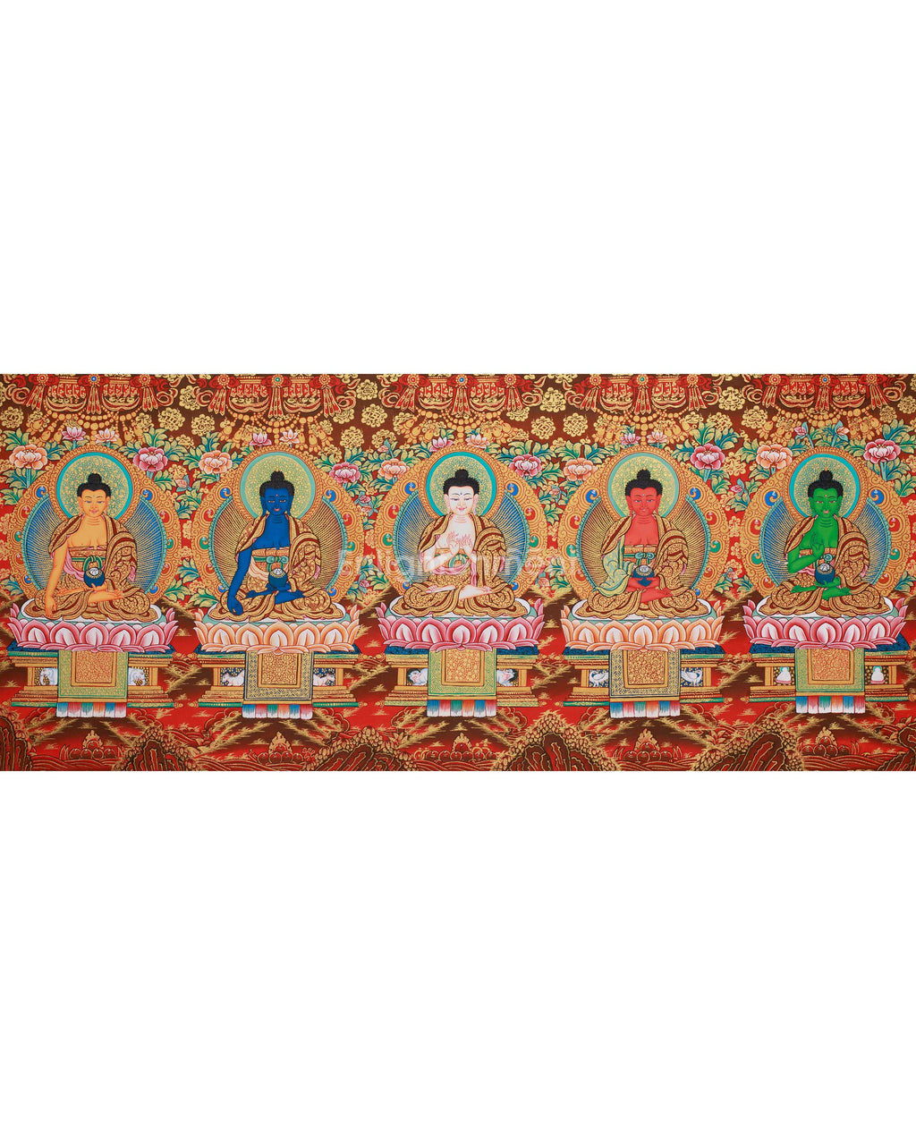 Each of the Five Dhyani Buddhas is depicted seated on a Lotus throne, representing their purity and spiritual enlightenment. The stunning 24K gold accents in this thangka enhance the divine glow of each Buddha, resulting in a remarkable work that serves both as a piece for devotion and as an artistic marvel. The red canvas enriches the complex gold designs, providing vibrancy and depth to the scene, making it perfect for meditation and introspection.