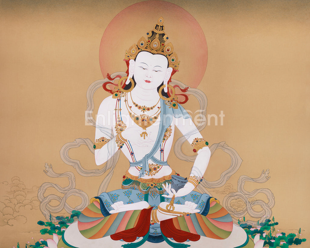 In this thangka, Vajrasattva is depicted in his majestic, divine form, seated peacefully on a lotus throne. He gently holds the vajra in his right hand and the bell in his left. His calm, peaceful face radiates wisdom and purity, while the golden halo around him highlights his enlightened spirit. The detailed robes he wears—the flowing garments—and the lotus petals beneath him symbolize the sacred power of transformation and purity. The soft background enhances the calming and healing energy of Vajrasattva, creating a peaceful space for growth and spiritual awakening.