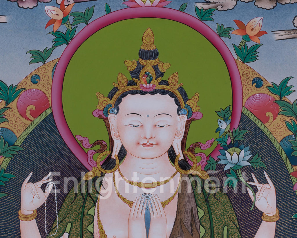Each brushstroke of this thangka embodies prayerful devotion, making it a luminous spiritual icon rather than a mere work of art. Its balanced composition, vibrant colors, and detailed gold accents make it a focal point of divine inspiration. Bring this stunning thangka into your home, temple, or meditation area, and allow Chenrezig's compassionate gaze to bless you with peace, healing, and spiritual growth.
