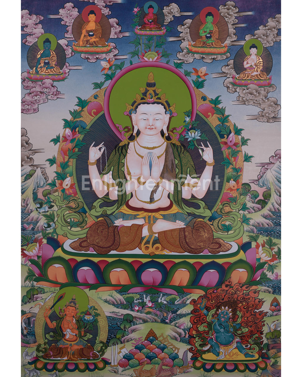 60-Inch Chenrezig Thangka | The Embodiment of Infinite Compassion with Manjushri, Vajrapani, and Five Dhyani Buddhas