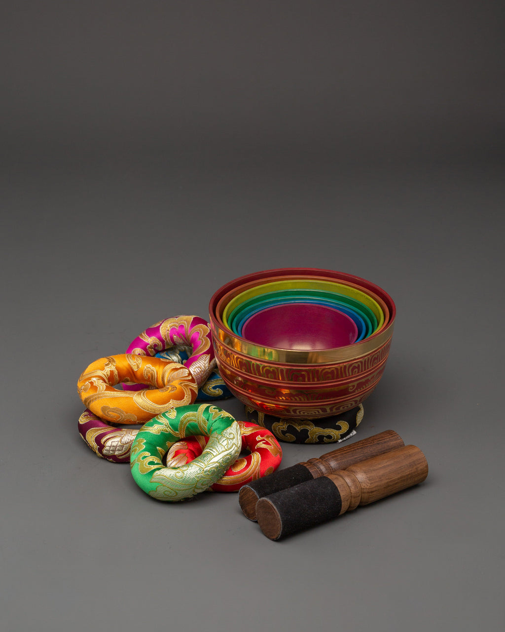 Expert artisans skillfully create every item in this set to ensure quality and authenticity. The bowls are made of brass and painted in brilliant acrylic hues, resulting in a visually pleasing and energetically invigorating outfit.