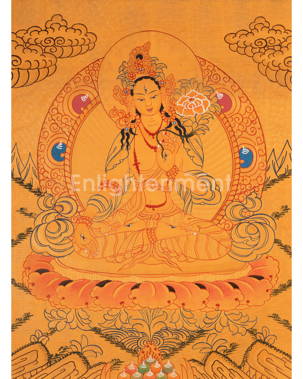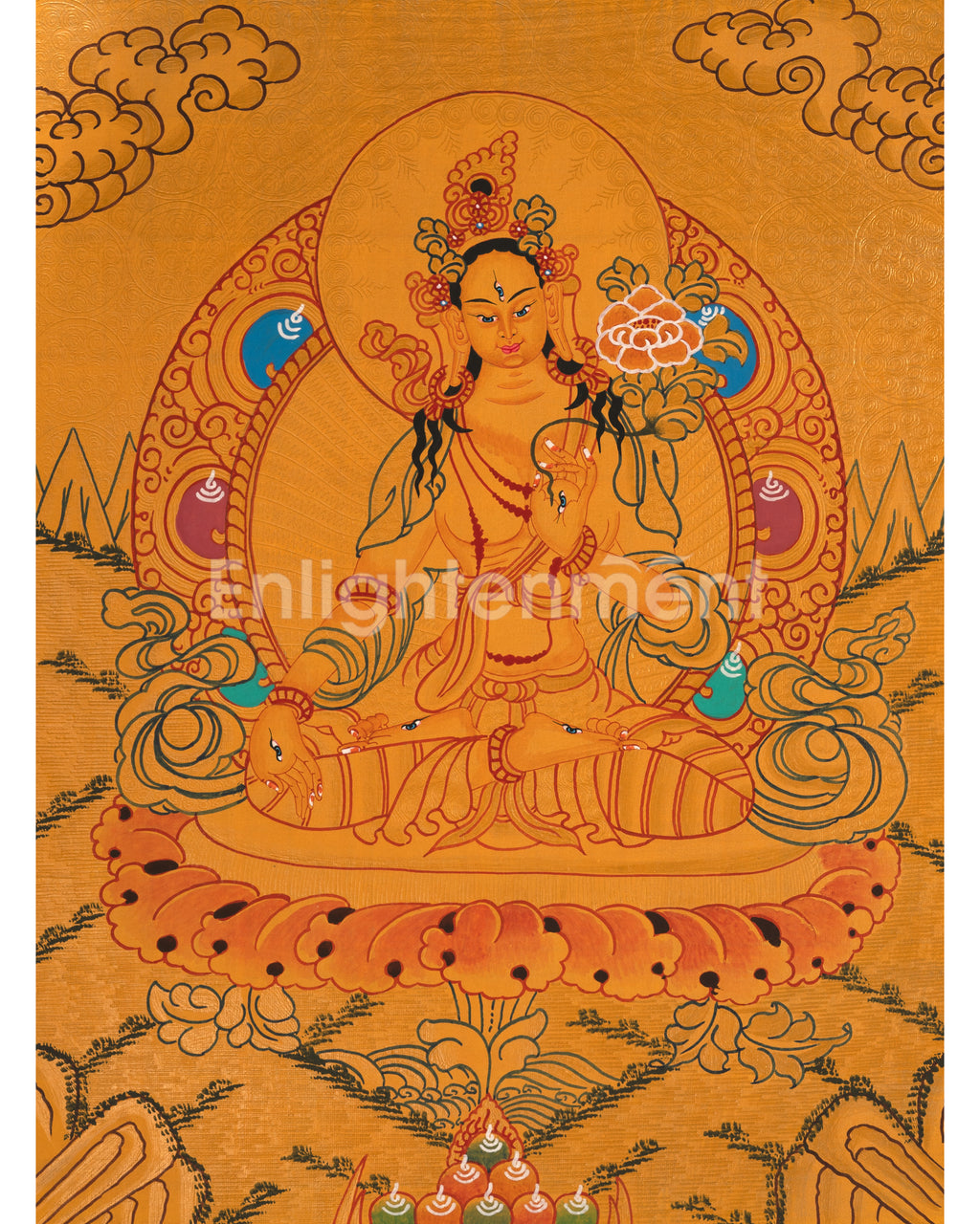 She is shown sitting in meditation, her right hand providing good fortune and her left holding a utpala flower, representing purity. Her seven eyes on her body - one on her forehead, one on each palm, and one on each foot - stand for her omniscient vision, enabling her to see all sentient beings' suffering and bestow blessings to reduce it. The cool, calm hues of her clothing exude serenity and tranquility, while the orange and gold background highlights her celestial presence. This Thangka is perfect for any sacred area, acting as a beautiful spiritual relic and a strong support for meditation and healing.