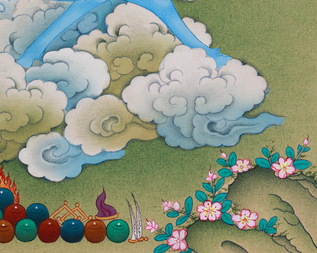 In this thangka, Achi Chokyi Drolma is depicted in her vibrant form, seated on a radiant lotus throne, a five-jeweled crown adorning her head, symbolizing her spiritual power. She holds a skull cup containing a Norbu (precious gem), symbolizing the transformation of obstacles into spiritual treasure. She is shown having a Chod damaru (ritual drum), representing the wisdom and spiritual mastery. The background, with clouds, mountains, and flowing waters, reflects her ability to bring protection, peace, and harmony to the world. Jigten Sumgon, a revered figure in the Drikung Kagyu lineage, is depicted above her, symbolizing their deep connection and shared mission to spread the Dharma. The dynamic composition of these two figures, painted in acrylic and gold, captures the powerful and nurturing relationship between them, blending their teachings and energies for the benefit of all beings.