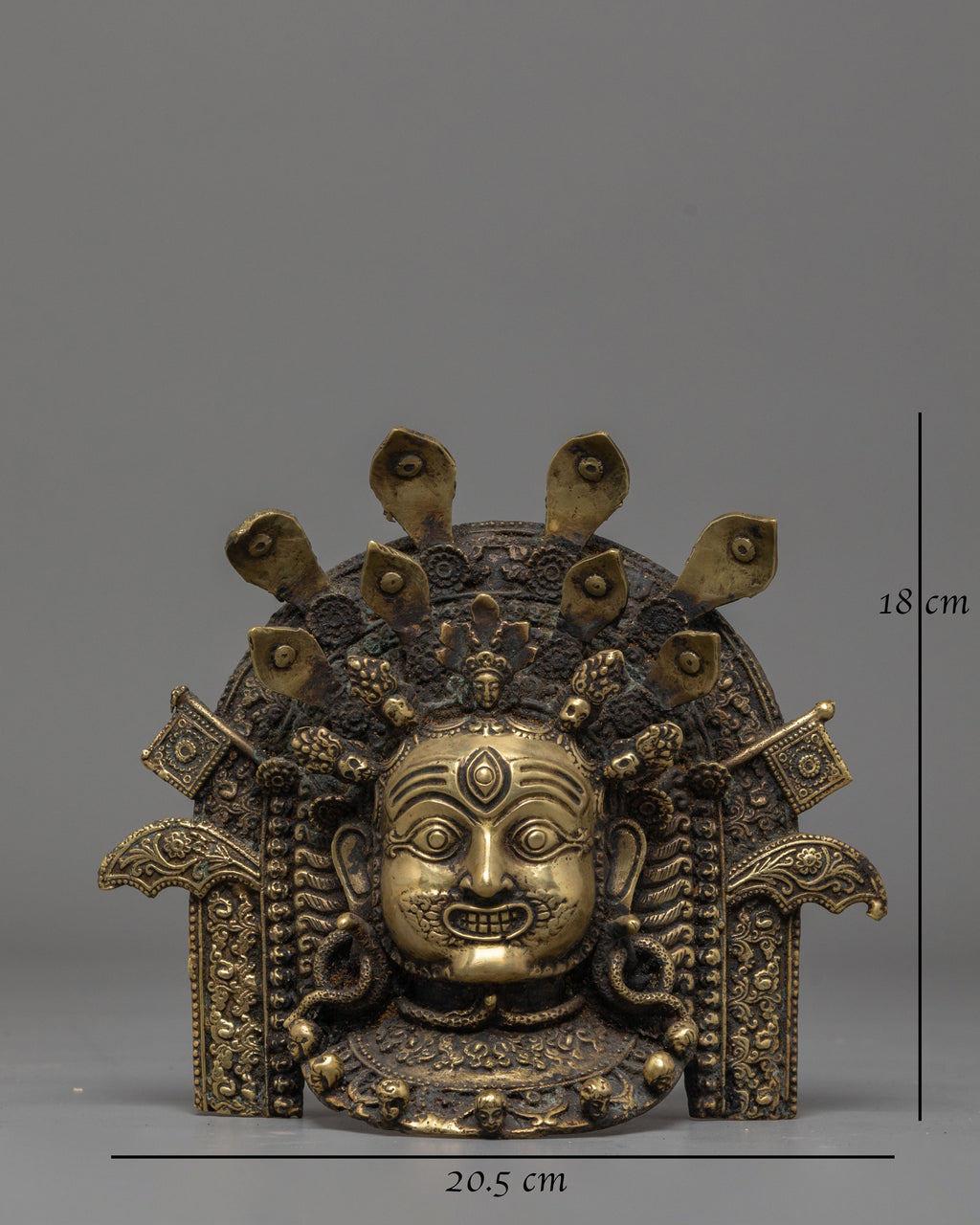 The Akash Bhairav Mask Wall Hanging is an intricately designed piece of spiritual art that represents Akash Bhairav, a fearsome deity in Hindu and Buddhist traditions. Measuring 18cm in height and 20.5cm in width, with a weight of 1.14kg, this bronze mask is a powerful decorative item for any space. The fine craftsmanship of the mask highlights the fierce yet protective expression of Bhairav, making it an ideal piece for those seeking spiritual protection or adding a sacred element to their living area. Its bronze finish adds a rich, ancient feel, enhancing its spiritual energy.