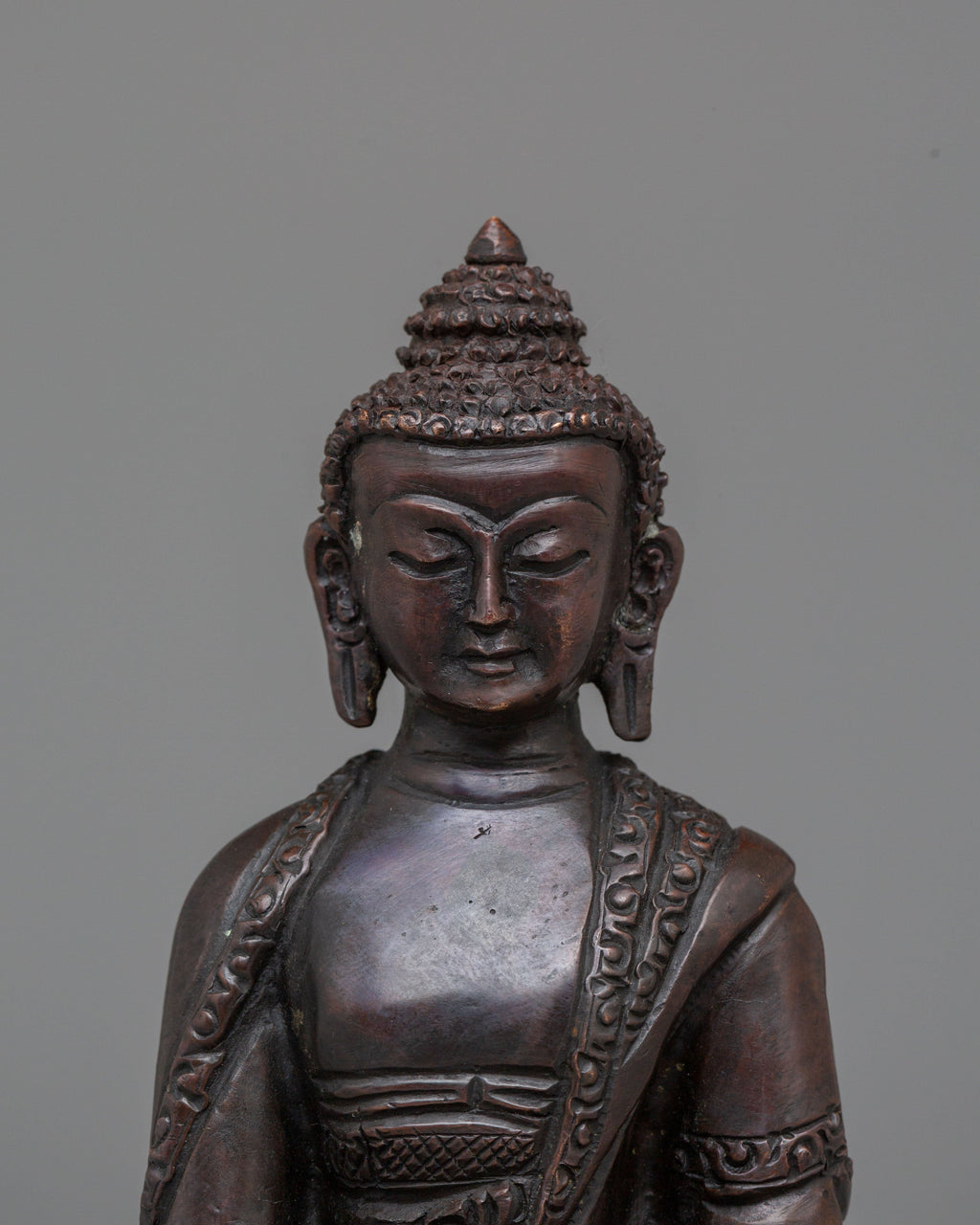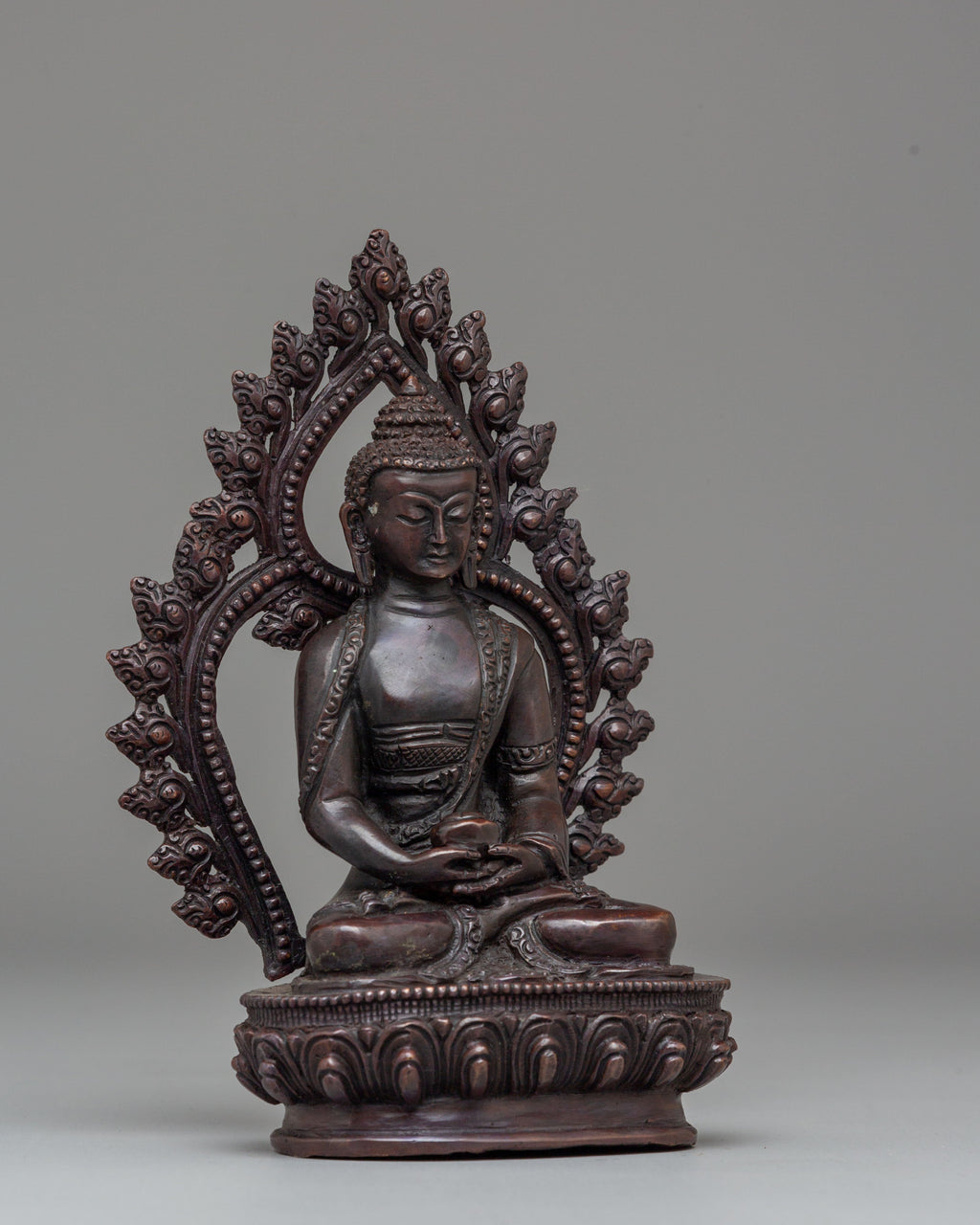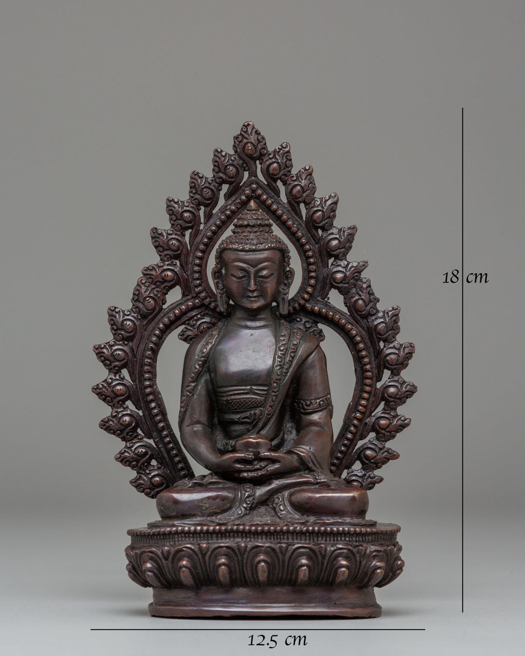 The Amitabha Buddha of Eternal Peace Sculpture stands 18 cm tall and has a base width of 12.5 cm. Crafted from an oxidized copper body. Crafted by expert artisans, this item embodies the rich traditions of Himalayan Buddhism, making it a valuable addition to altars, meditation spaces, or sacred collections.