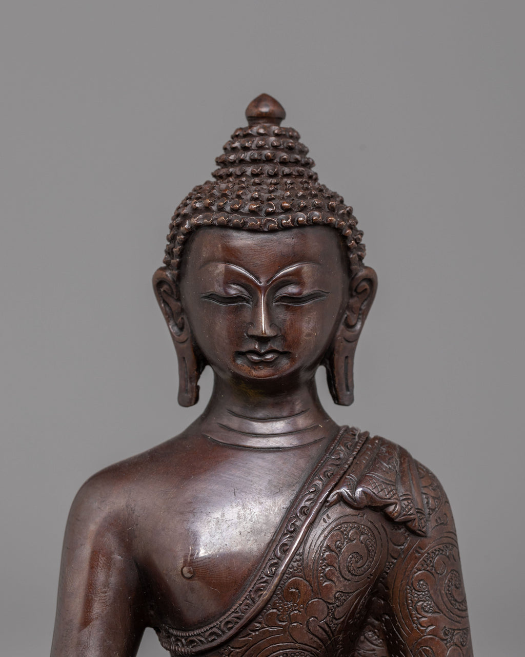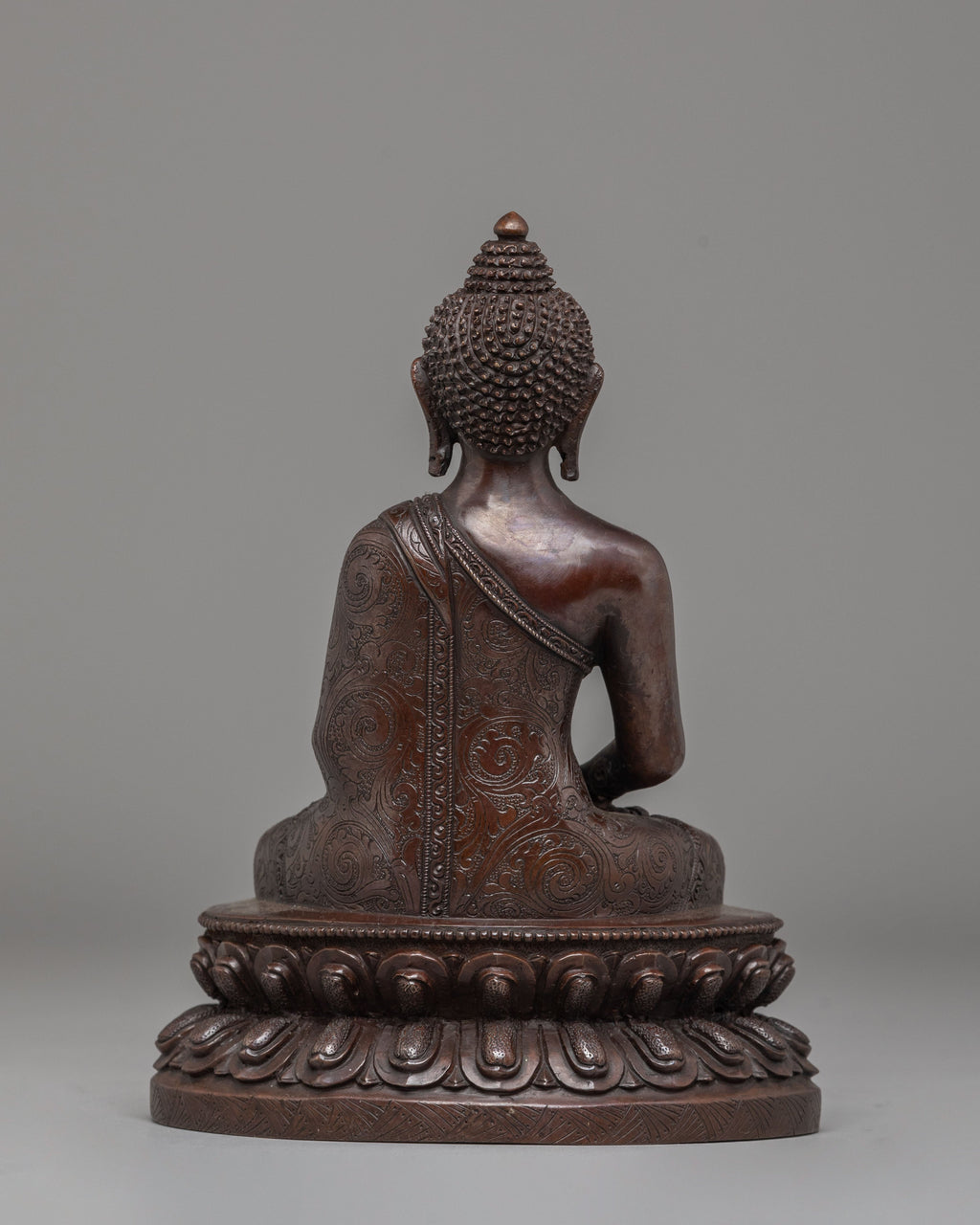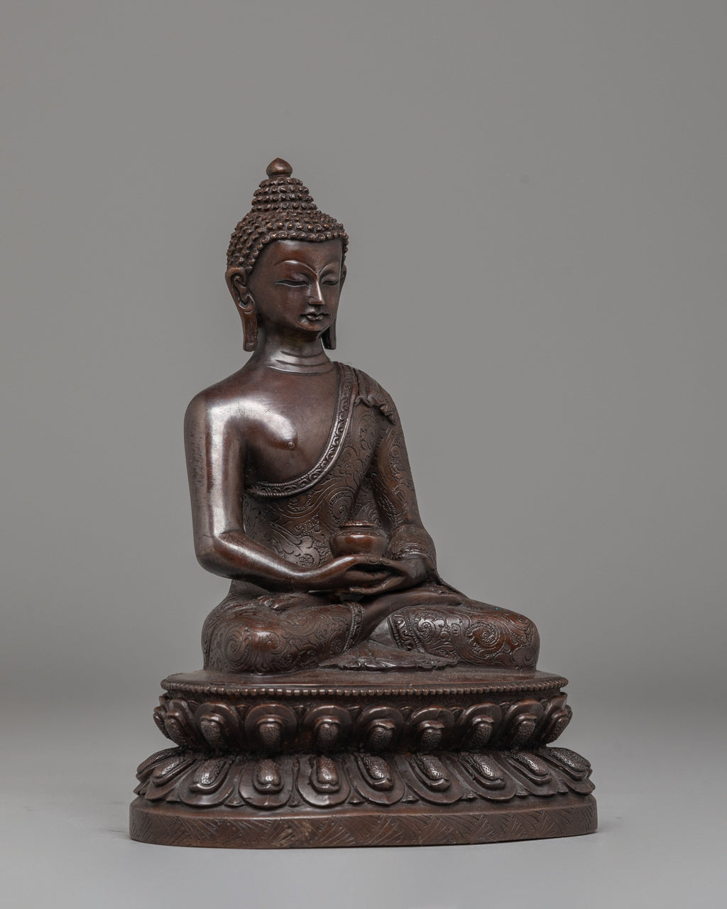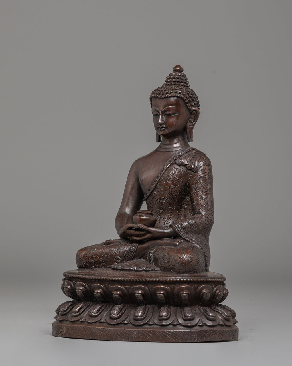This Amitabha Buddha statue is an intricately handcrafted piece produced in our studio and designed with unique Nepali motifs. This is entirely comprised of oxidized copper, giving it its final elegant look. Here in the statue, the Buddha can be seen peacefully sitting upon a moon disc lotus with an alms bowl over his lap, carried by his two hands, which are in the precise position of a 'Dhyan Mudra,' a characteristic hand gesture of Amitabha Buddha.