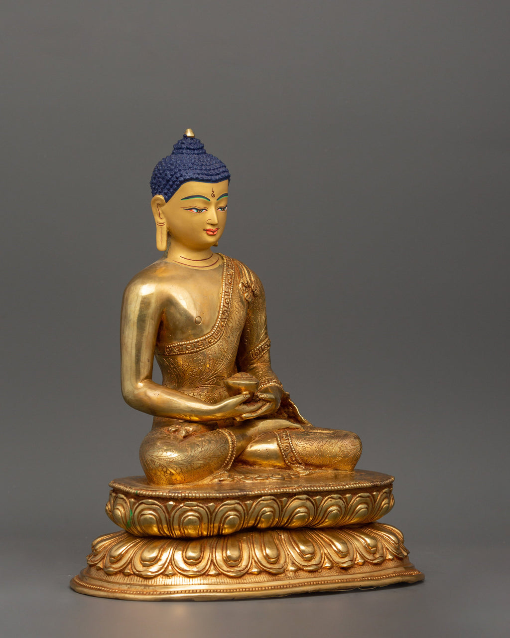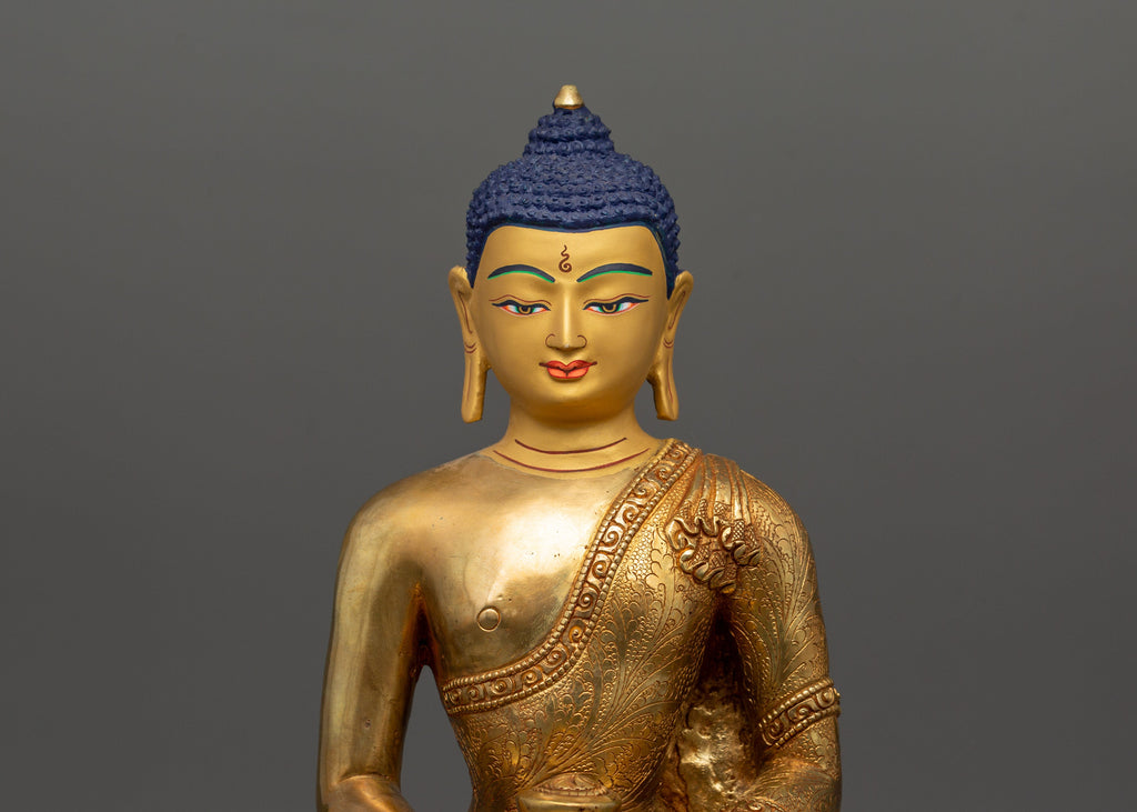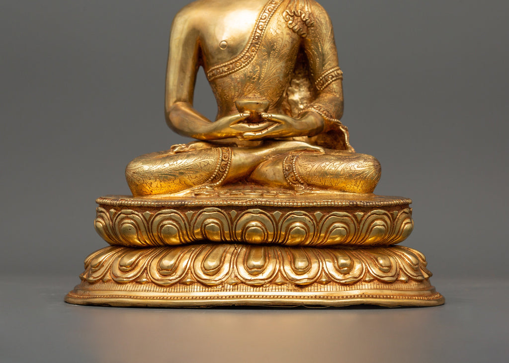 This elegant Amitabha Buddha statue, made of copper with gold plating, perfectly portrays the essence of serenity and enlightenment. The Buddha is represented in the Dhyana Mudra, a gesture representing deep concentration and inner tranquillity while sitting gracefully on a lotus. The beautiful gold plating enhances its spiritual presence, giving the statue a peaceful and dazzling image. This elegant art perfectly captures Amitabha Buddha's compassion and wisdom.