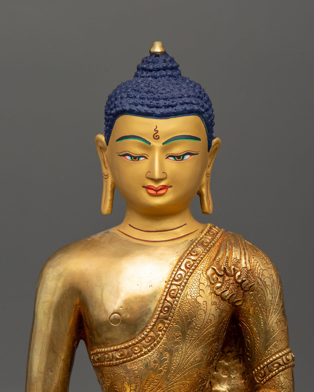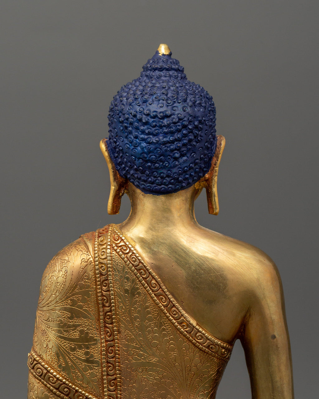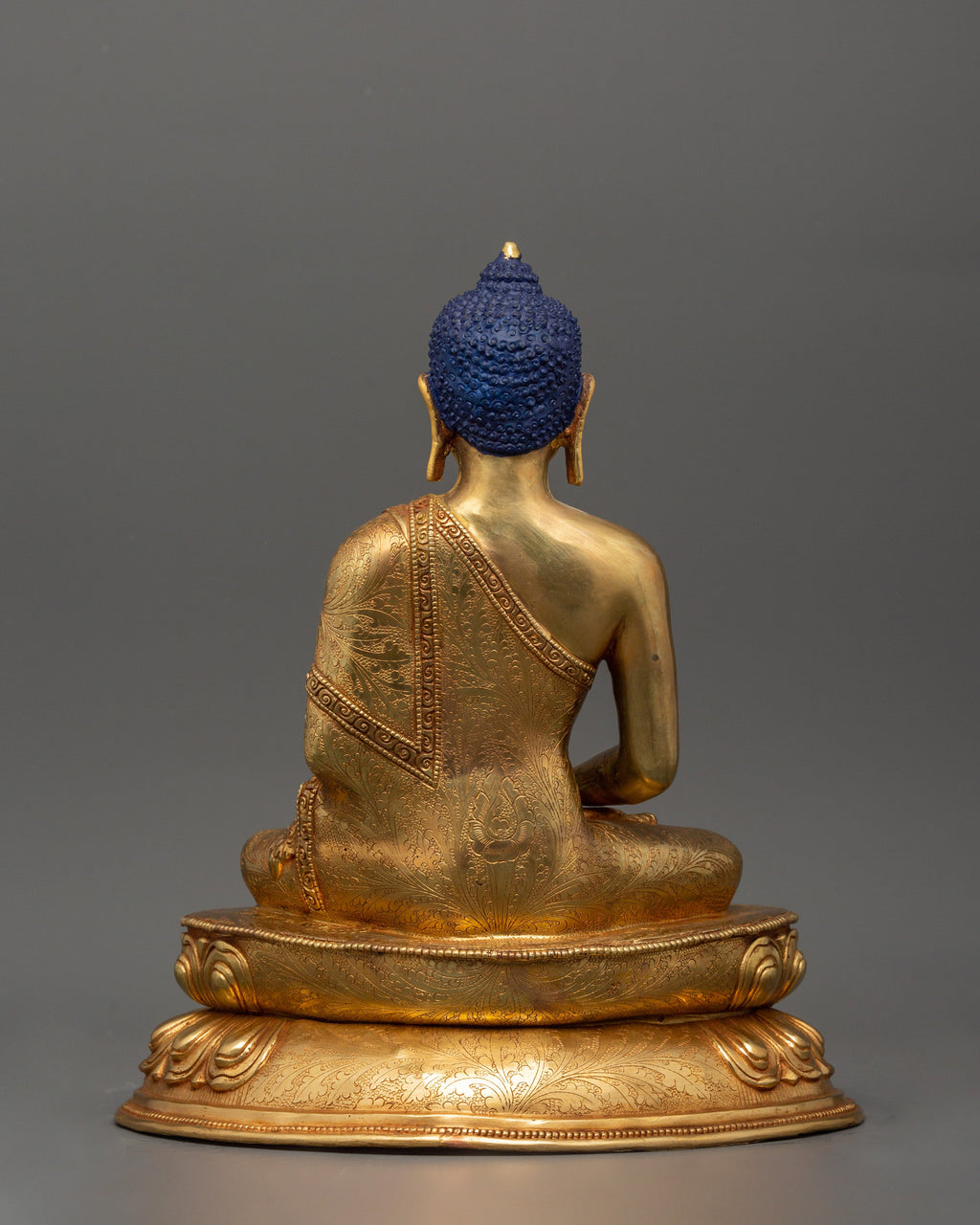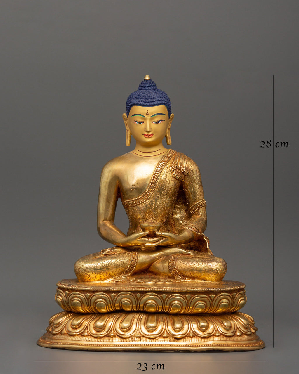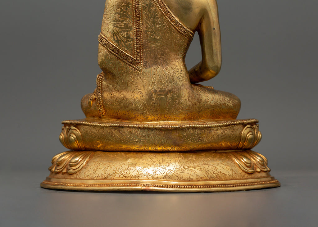 This diligently carved statue is solid and attractive, standing 28 cm tall, 23 cm wide, and weighing 3.02 kg. The detailed pattern, paired with the copper substance and gold finish, represents itsbeauty. This statue, which is perfect for meditation spaces, altars, or as a decorative centerpiece, adds a sense of serenity, mindfulness, and spiritual grace to any environment.