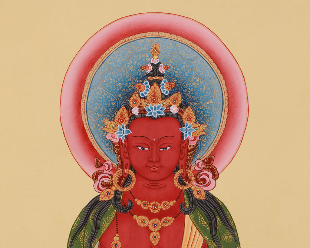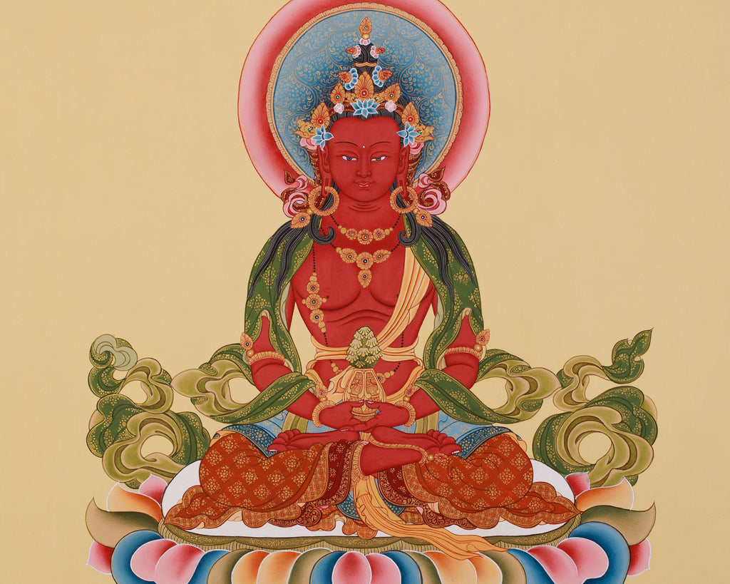 He is shown seated elegantly on a lotus base in a meditative posture, which symbolizes spiritual awakening and purity. His serene face radiates calm and compassion, while his red body represents the vitality and life power of all sentient beings. He is holding a kalasha (a vase of nectar) in his hands, which symbolizes the healing potion of immortality and the blessings of long life. His heavenly essence is reflected in his jewel-encrusted crown and ornaments, as well as his robes with exquisite patterns.