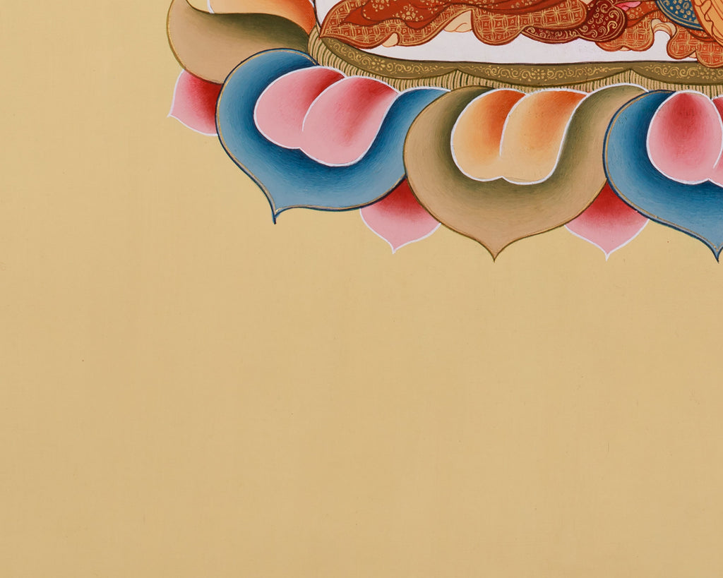 In the background, a halo surrounds his head, signifying his enlightened state and spiritual radiance. The thangka features a serene yellow background, symbolizing wisdom and spiritual enlightenment, closely associated with Amitayus Buddha. The color symbolizes calmness and unity with nature and is revered for its ability to grant longevity and compassion to those seeking its blessings. It is an excellent addition to meditation rooms, altars, or sacred spaces and serves as a reminder of infinite life and wisdom.