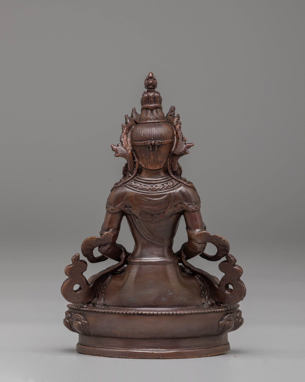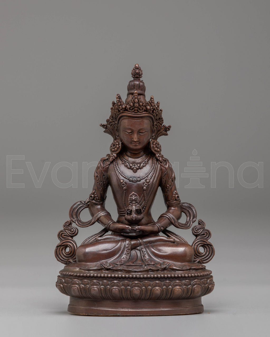 The Amitayus Buddha statue is crafted from oxidized copper and features intricate detailing. Its serene expression symbolizes the Buddha's role as the giver of long life and good health. The statue showcases traditional Tibetan craftsmanship, making it a meaningful addition to any spiritual space.