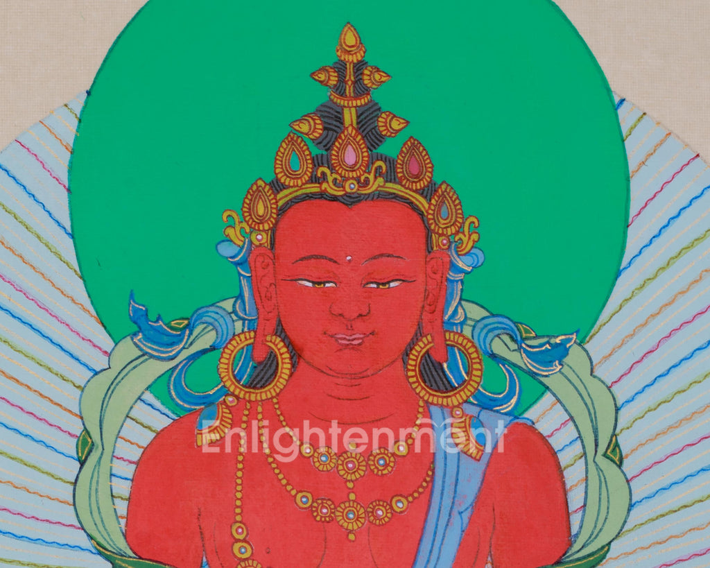 In this thangka, Amitayus, the Buddha of Longevity, is depicted seated in a meditative posture, symbolizing wisdom and eternal life. His serene expression, complemented by the glowing green halo behind his head, emphasizes his peaceful and protective nature. Amitayus is depicted on a delicate lotus seat, symbolizing purity, and is surrounded by a collection of jewels representing his blessings. This thangka beautifully captures the essence of Amitayus as a symbol of longevity and immortality, inviting the viewer to reflect on the timelessness of wisdom and spiritual well-being. The colors of the thangka—such as rich reds and blues—enhance the feeling of divine presence, while the use of gold further emphasizes the sacredness of this image.