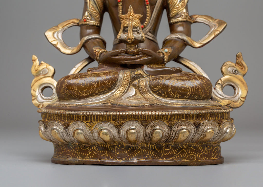 Amitayus, the Buddha of Infinite Life, is depicted in a serene seated posture, holding a vessel of nectar, which symbolizes the elixir of immortality and eternal life. The rich electro gold and silver plating give the statue a divine radiance, while the oxidized copper body adds depth and warmth to the figure. The inclusion of coral and turquoise stones, which are highly regarded in Tibetan Buddhism, further symbolizes spiritual healing and protection. This beautifully designed statue not only serves as a decorative object but also as a powerful spiritual tool to promote longevity and well-being.