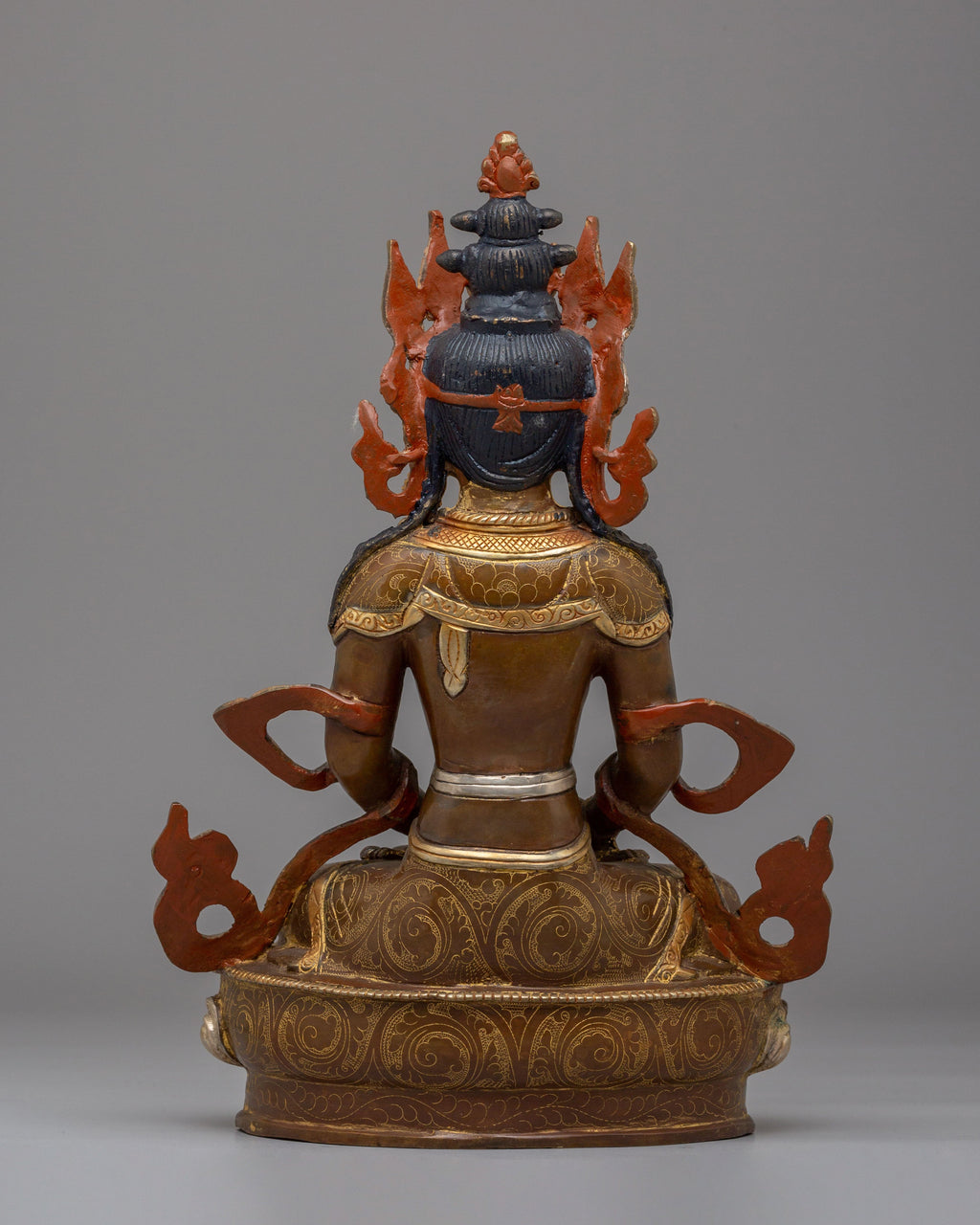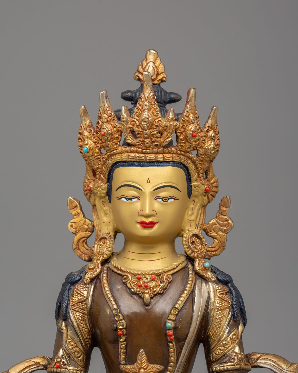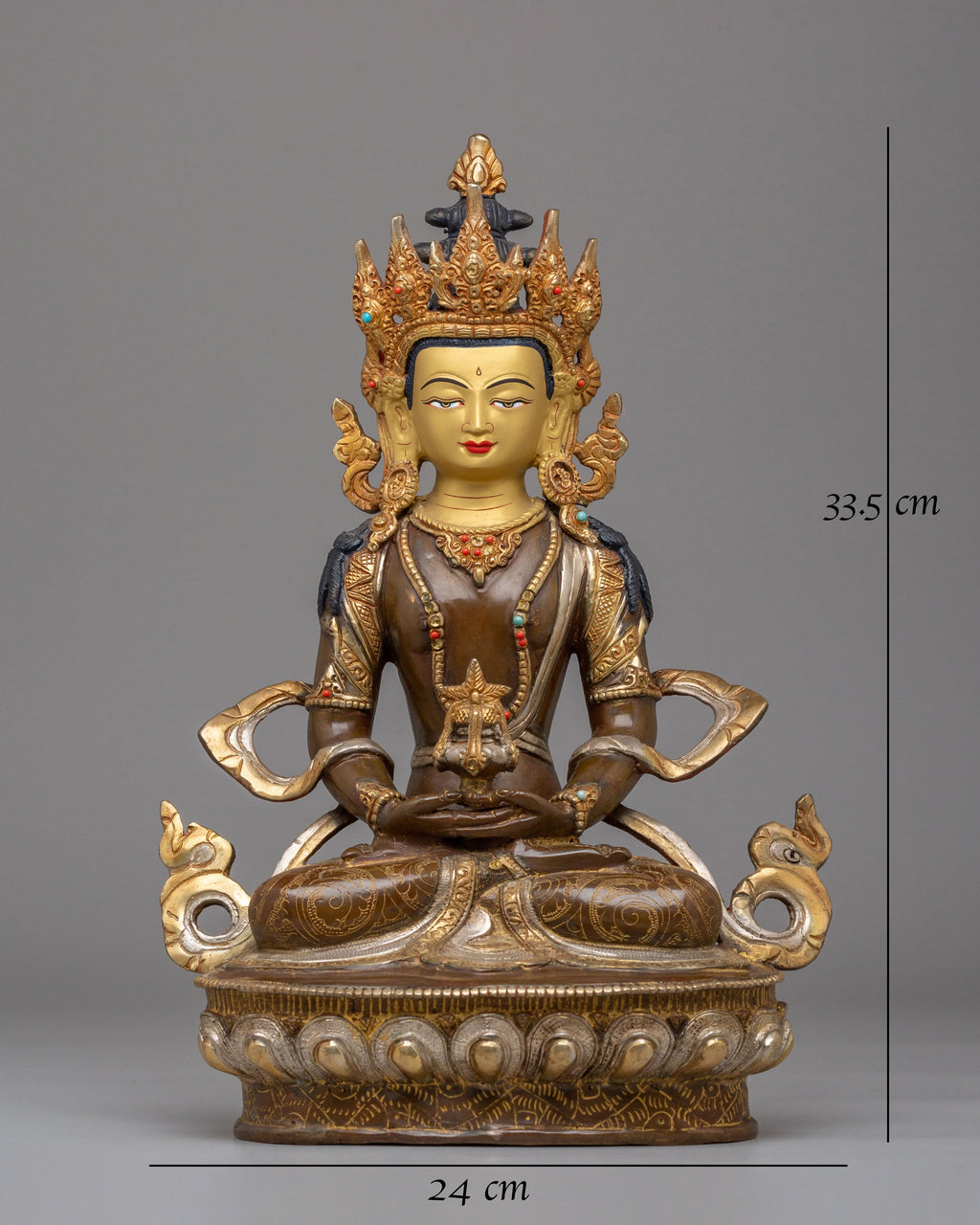 The Amitayus Statue for Longevity is a stunning representation of the Buddhist deity Amitayus, symbolizing long life, health, and spiritual well-being. Standing at 33.5cm tall and weighing 3.04kg, this exquisitely crafted statue is made from a combination of high-quality materials, including an oxidized copper body, electro-gold plating, electro-silver plating, and 24K gold gilding. Vibrant acrylic colors highlight the intricate details, while carefully placed coral and turquoise stones enhance its spiritual significance, embodying vitality, balance, and protection.
