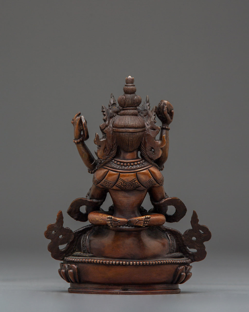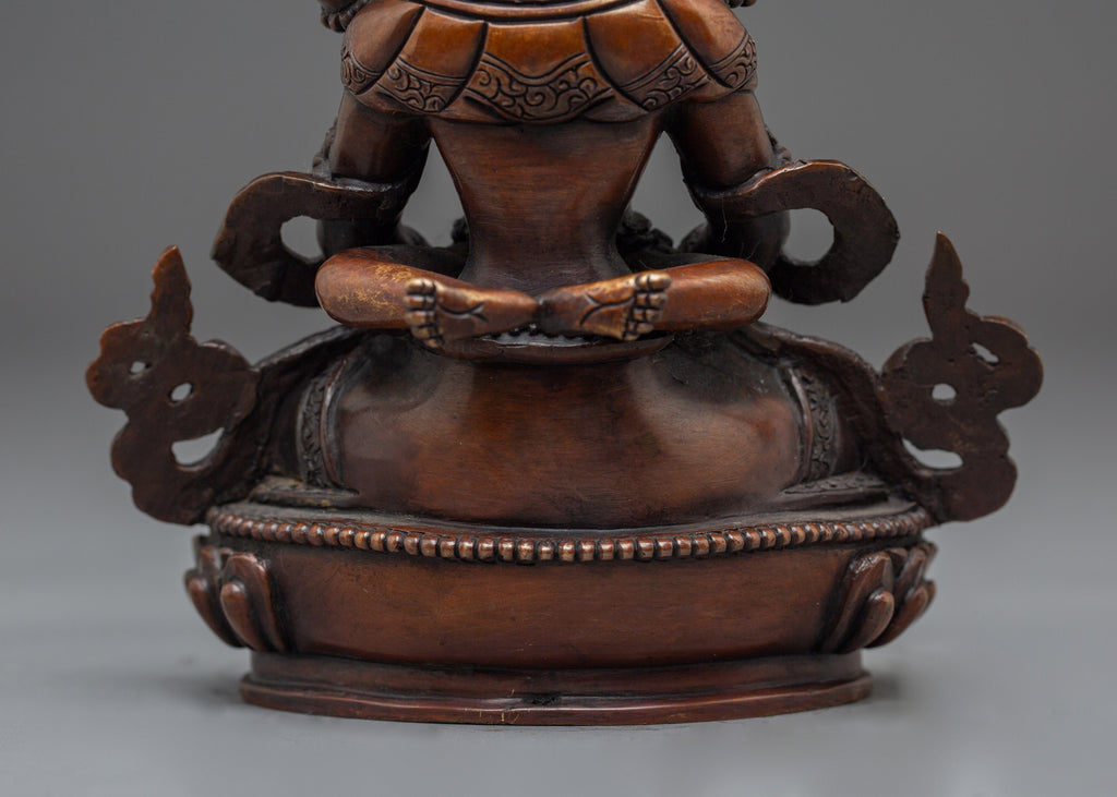 Amitayus is represented sitting in a meditative posture, indicating his vast wisdom and unwavering concentration. His hands are in dhyana mudra, holding a kalasha, a holy vase filled with the nectar of immortality, representing his function as the giver of long life and energy. His calm demeanor radiates compassion and inner peace, Inspiring practitioners to practice mindfulness and tranquility.