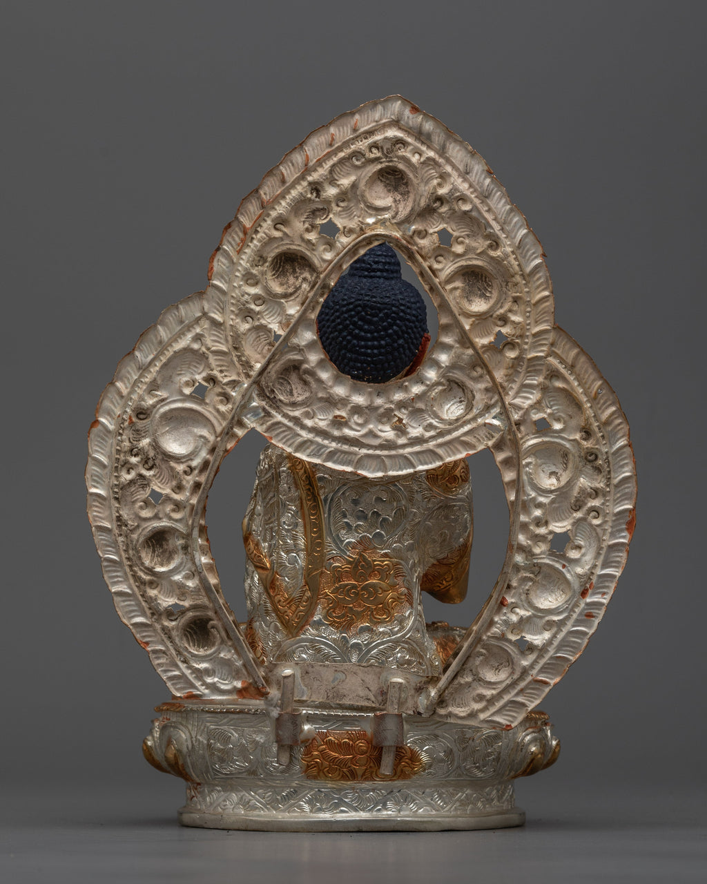 Discover the serene charm of our Amoga Siddhi Silver Plated Statue, which was lovingly created by expert artisans. This statue stands 10.2 inches tall and has a 7.5-inch base. It is made of copper and is adorned with 24K gold gilding, silver plating, and delicate acrylic paintings. Amoga Siddhi, one of the Five Dhyani Buddhas, embodies the wisdom of perfect practice and conquering envy.