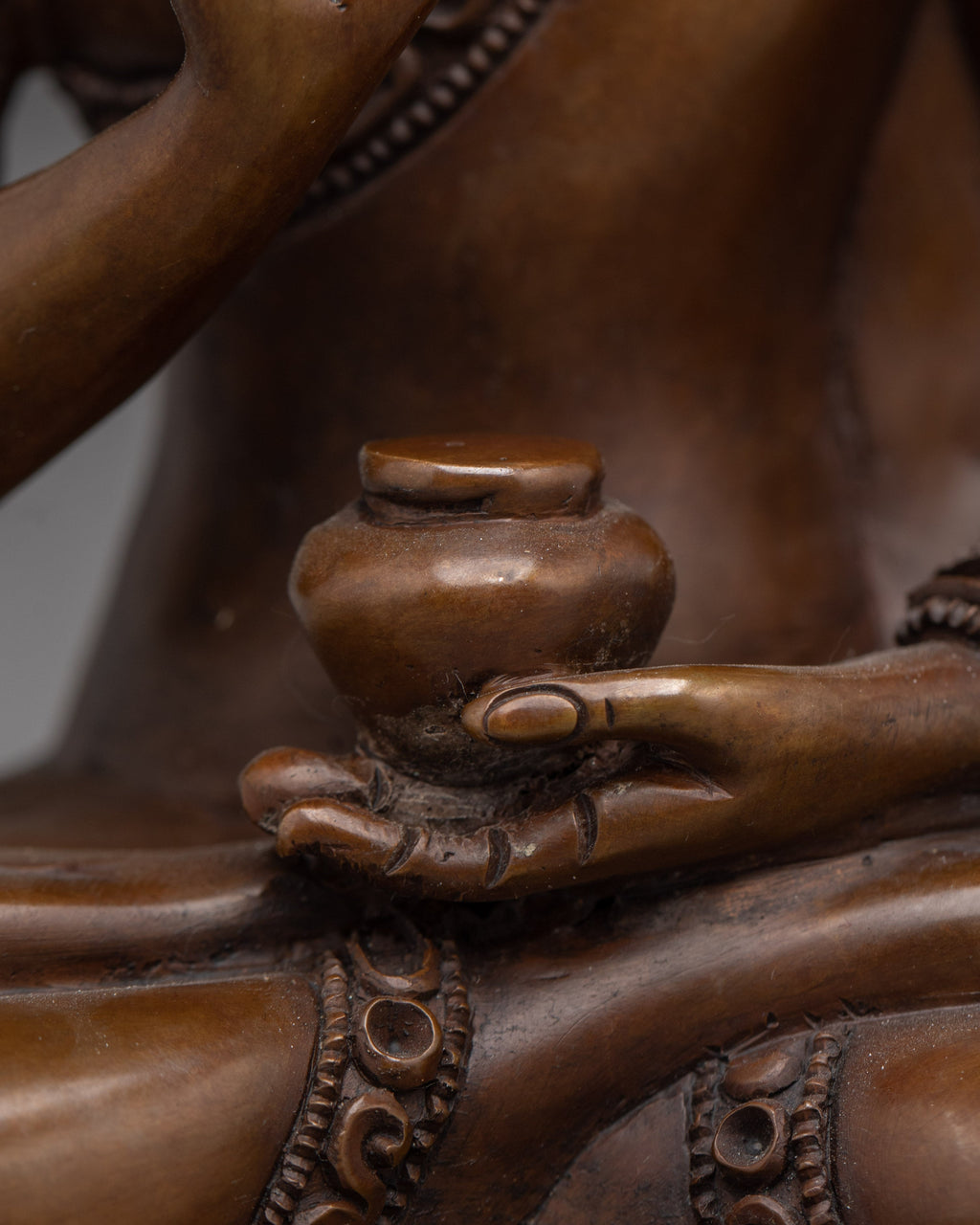 This stunning Amogasiddhi Buddha statue, made from oxidized copper by talented artisans in Nepal, is a representation of enduring knowledge. From the calm expression to the flowing apparel, every detail of this 6.3-inch-tall sculpture is carefully handcrafted to showcase centuries of Himalayan artistry. A traditional alms bowl is held in the left hand, which is in meditative calm. The encouraged right hand, in the Abhaya Mudra, represents protection and eliminates fear.