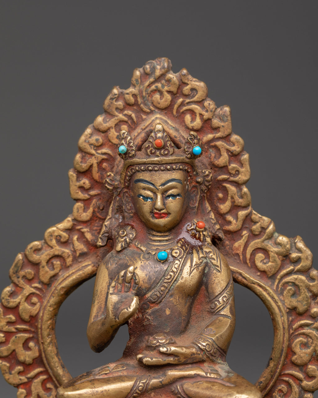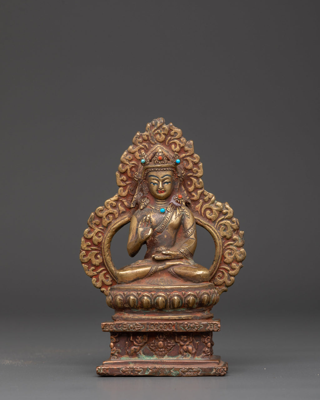 This Amogasiddhi sculpture is produced with great care and respect for the Buddha's teachings. The statue, crafted from bronze, boasts stunning craftsmanship and inlaid gemstones that enhance the Buddha's serene presence. This 15cm sculpture not only depicts Buddhist teachings but also serves as an effective symbol for cultivating inner serenity and fearlessness in everyday life. The Amogasiddhi Sculpture, whether shown as part of your meditation practice or as an art piece, will bring spiritual energy to any place.
