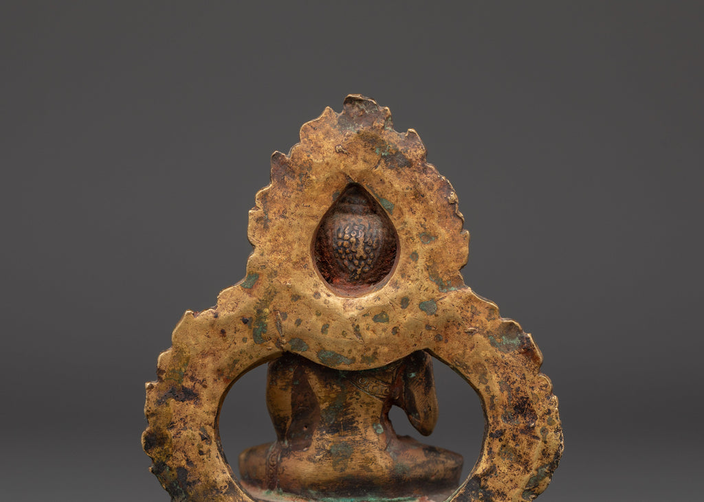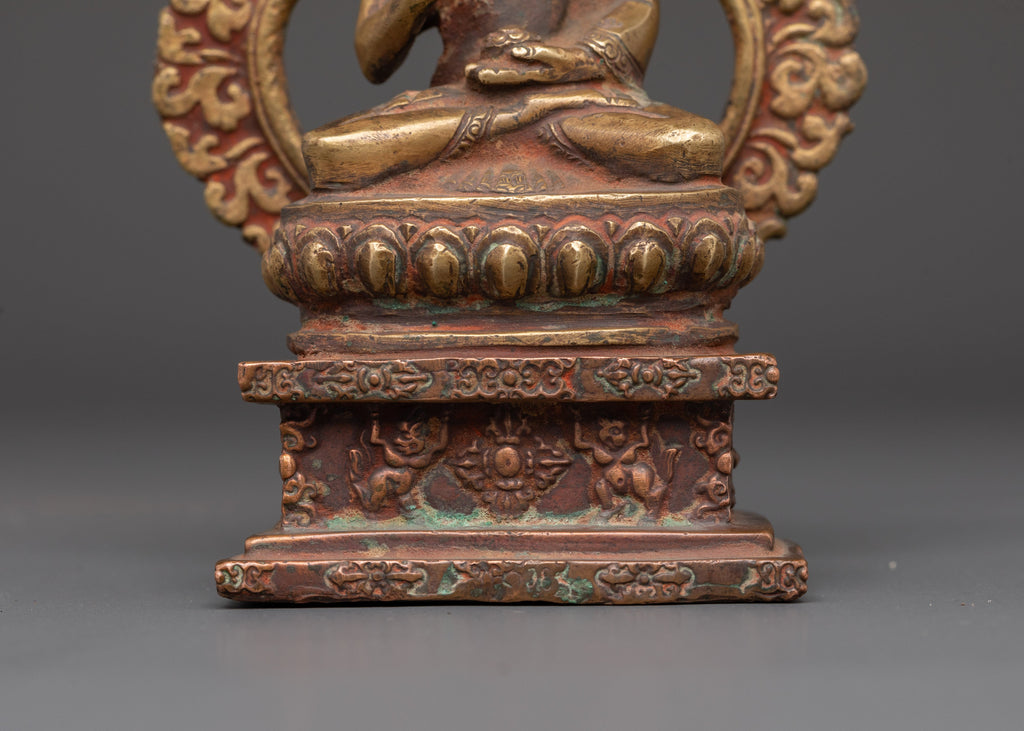This Amogasiddhi Sculpture is an outstanding 15cm bronze statue carefully created by expert artisans. The statue depicts Amogasiddhi, the Buddha of Fearlessness and the spiritual embodiment of unwavering confidence. This bronze Tibetan Buddha, adorned with beautiful decorations, brings peacefulness and spiritual energy to your sacred space. This Himalayan artwork, perfect for meditation rooms, home altars, or as a memorable gift, radiates quiet and tranquility.