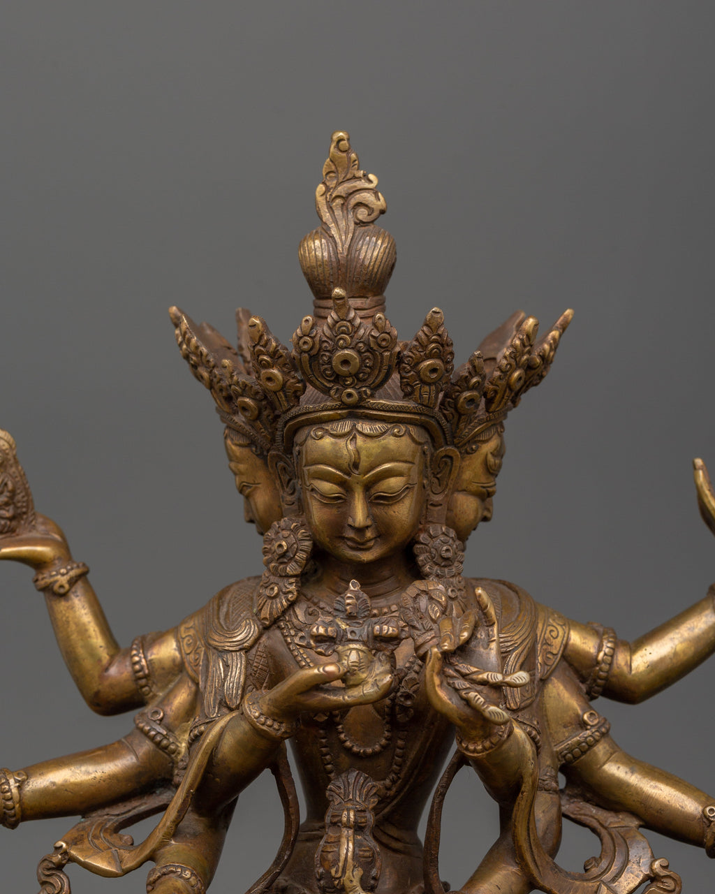 This antique copper statue of Namgyalma, a profound representation of longevity and spiritual purification, can help you invoke timeless wisdom and supernatural protection. According to Tibetan Buddhism, Namgyalma (Ushnisha Vijaya), a goddess of long life with three peaceful faces and eight elegantly extending arms, is capable of cleansing even the most formidable karmic impediments. Expertly fashioned from copper, this statue stands 21 cm tall and 23.5 cm wide. Its rich antique finish adds to its spiritual beauty and historical significance.