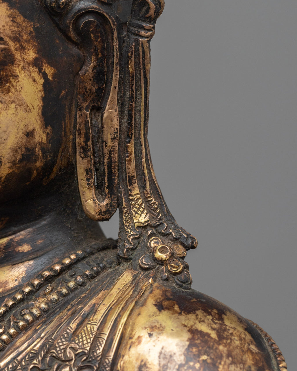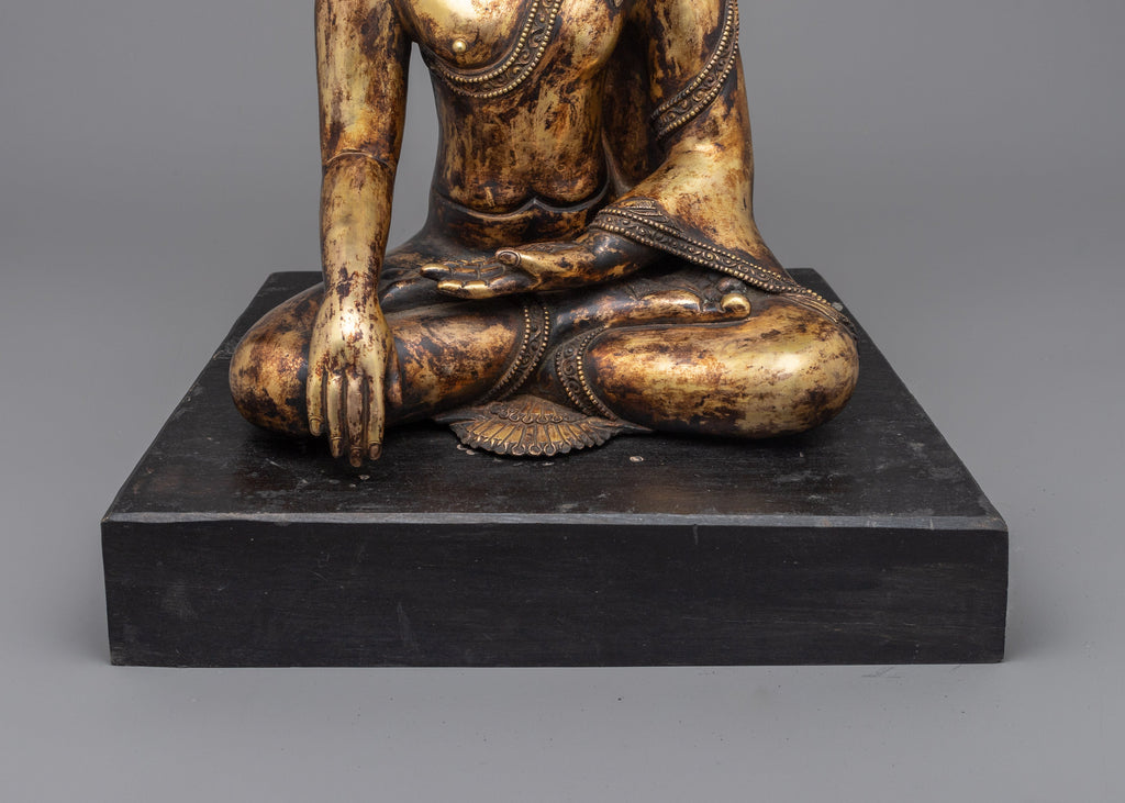 The Antique Crown Shakyamuni Buddha Statue is a representation of eternal knowledge and calm. Let it envelop you. This amazing statue, which is 25.4 inches tall and weighs 16.77 kg, was carefully created with great attention to detail. Its profound presence inspires awe. This statue exudes a sense of calm and divine grace. It is made of 24K gold-gilded copper with an antique finish. It is adorned with delicate craftsmanship and intricate detailing. Every feature of this sculpture captures the infinite wisdom of the Enlightened One, from the serene expression on Shakyamuni Buddha's face to the flowing robes that represent his compassion. After you place it in your sacred area, allow its calm energy to lead you toward enlightenment and inner serenity.
