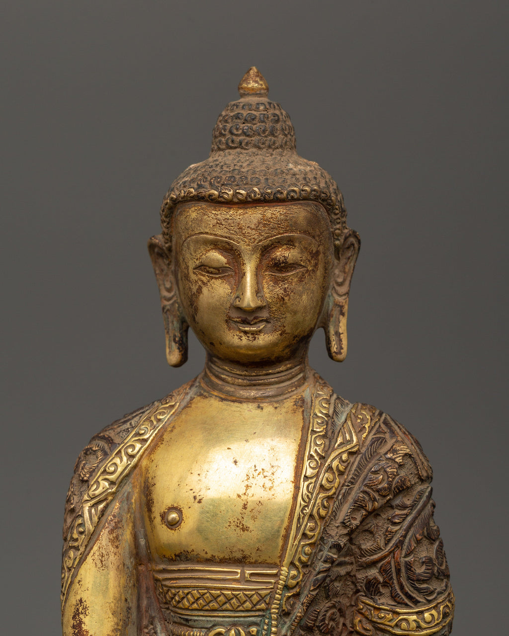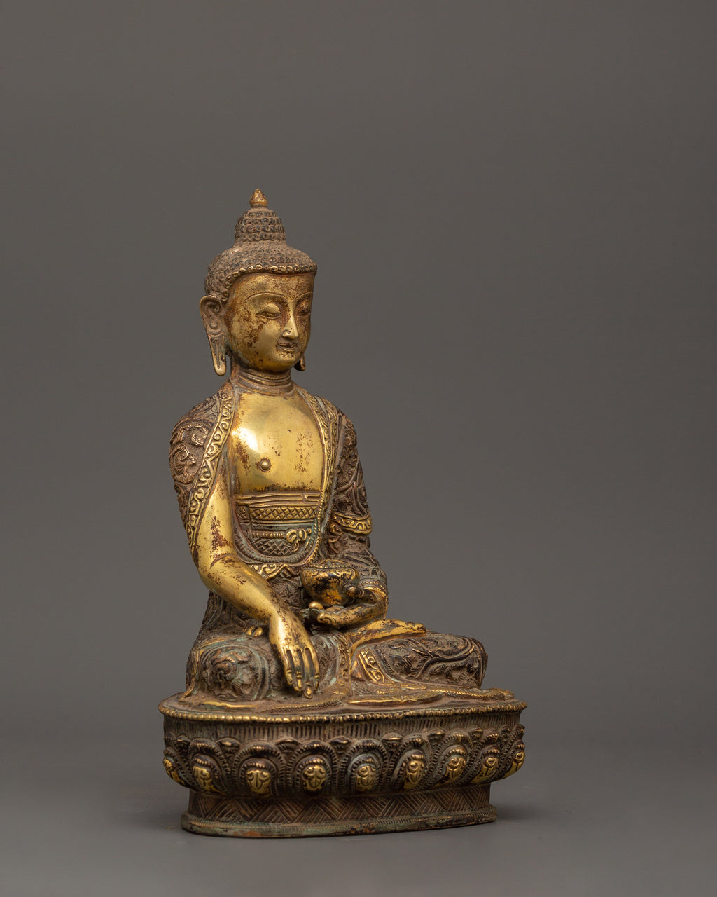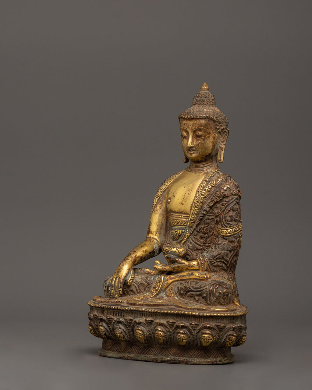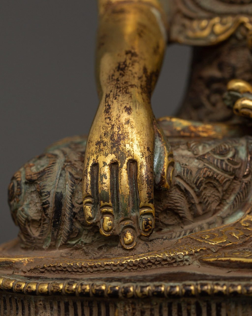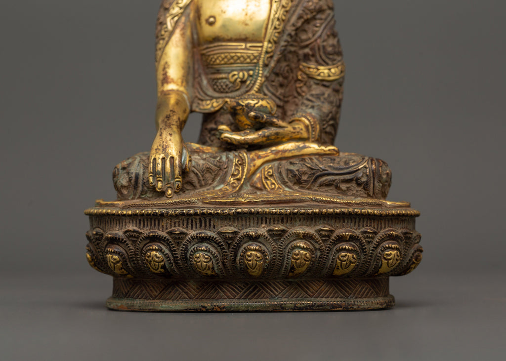 In Buddhism, the Shakyamuni Buddha's artwork has great meaning. His right hand is shown reaching for the ground in the earth-touching (Bhumisparsha) mudra, requesting that the Earth bear witness to his enlightenment. The Buddha's awakening beneath the Bodhi tree, when he overcame ignorance and achieved ultimate wisdom, is symbolized by this powerful gesture. The dhyana (meditation) mudra, in which his left hand rests in his lap, represents introspection and inner tranquility. This sculpture's gold-plated copper body, which has been given an antique polish, highlights the fine details of his robes and face, perfectly encapsulating traditional Himalayan workmanship.