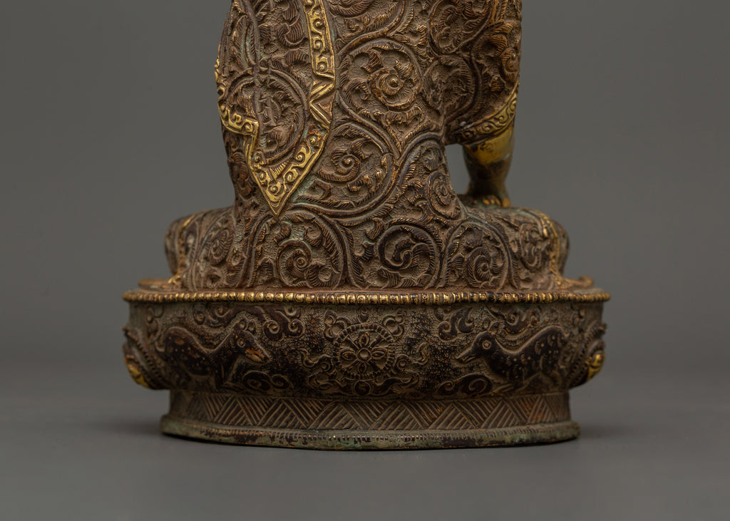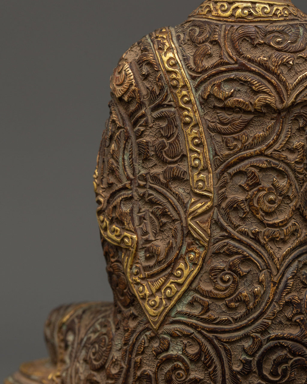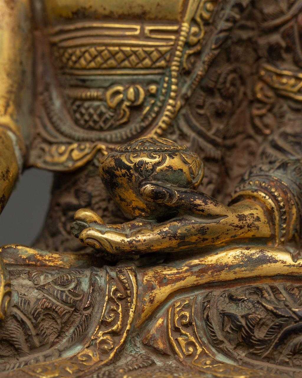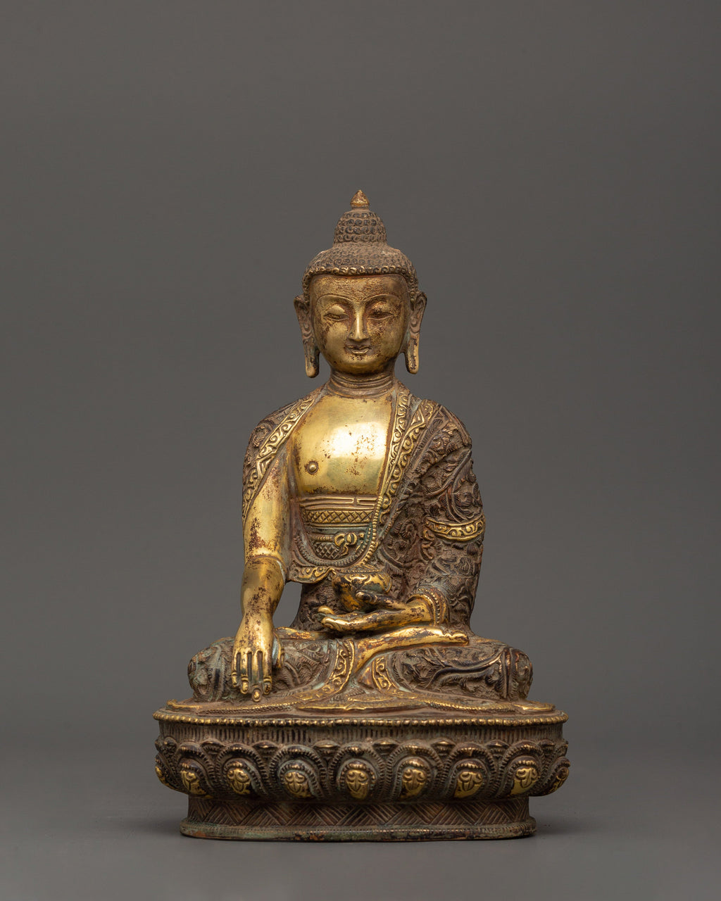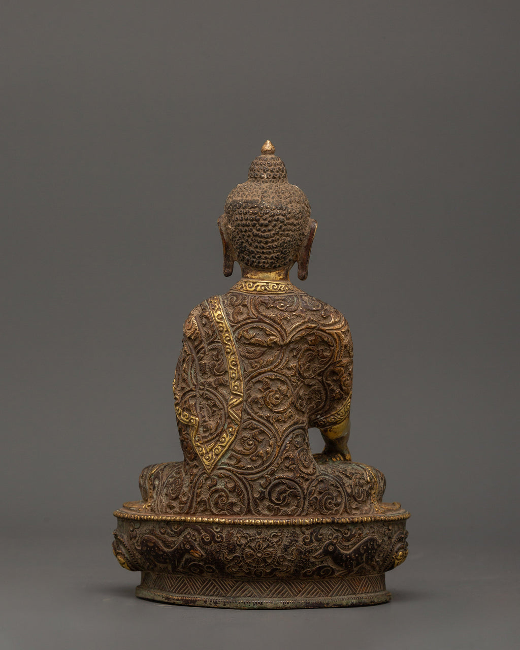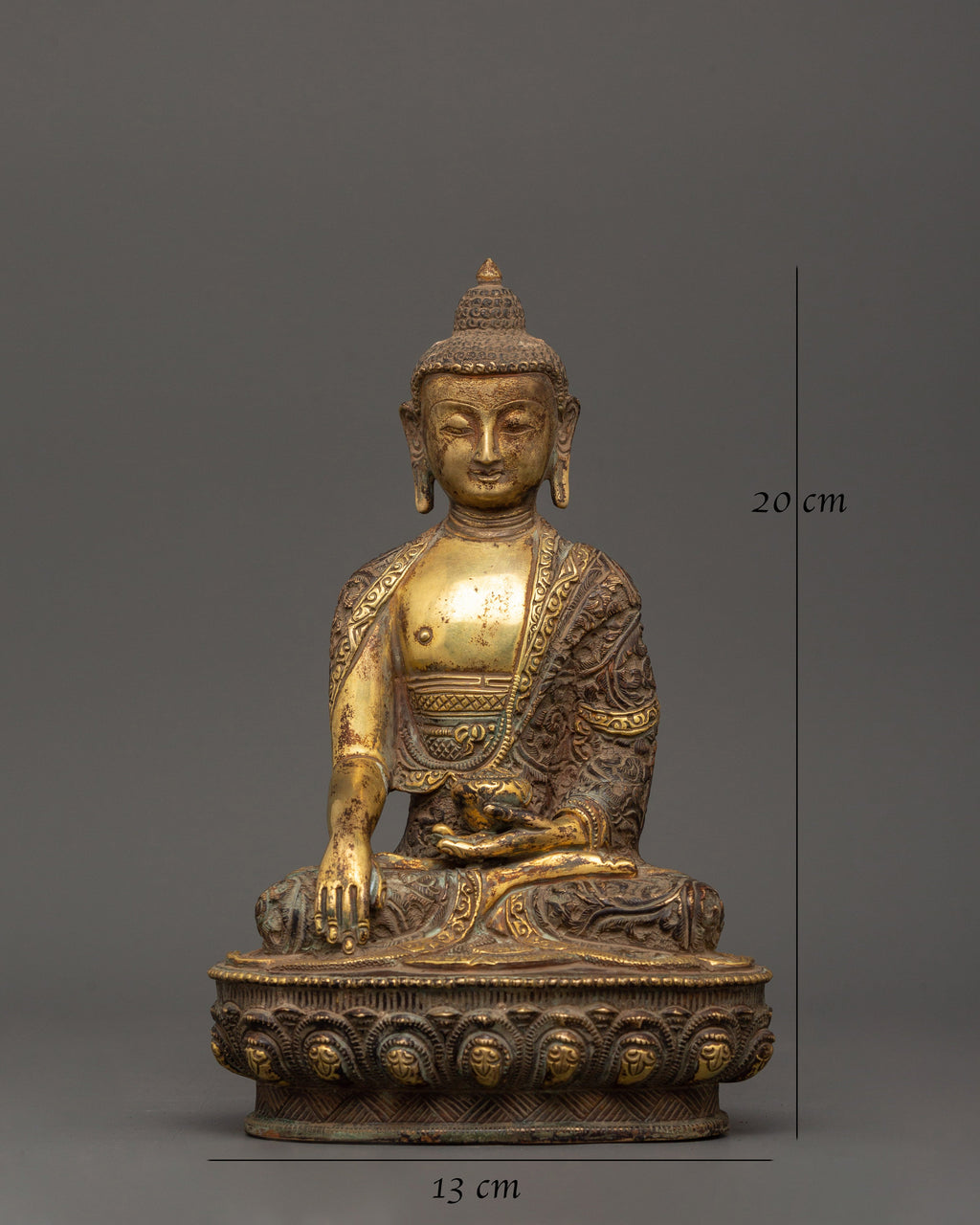 In Buddhism, the Shakyamuni Buddha's artwork has great meaning. His right hand is shown reaching for the ground in the earth-touching (Bhumisparsha) mudra, requesting that the Earth bear witness to his enlightenment. The Buddha's awakening beneath the Bodhi tree, when he overcame ignorance and achieved ultimate wisdom, is symbolized by this powerful gesture. The dhyana (meditation) mudra, in which his left hand rests in his lap, represents introspection and inner tranquility. This sculpture's gold-plated copper body, which has been given an antique polish, highlights the fine details of his robes and face, perfectly encapsulating traditional Himalayan workmanship.