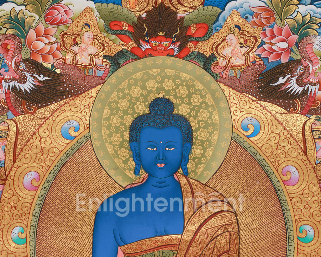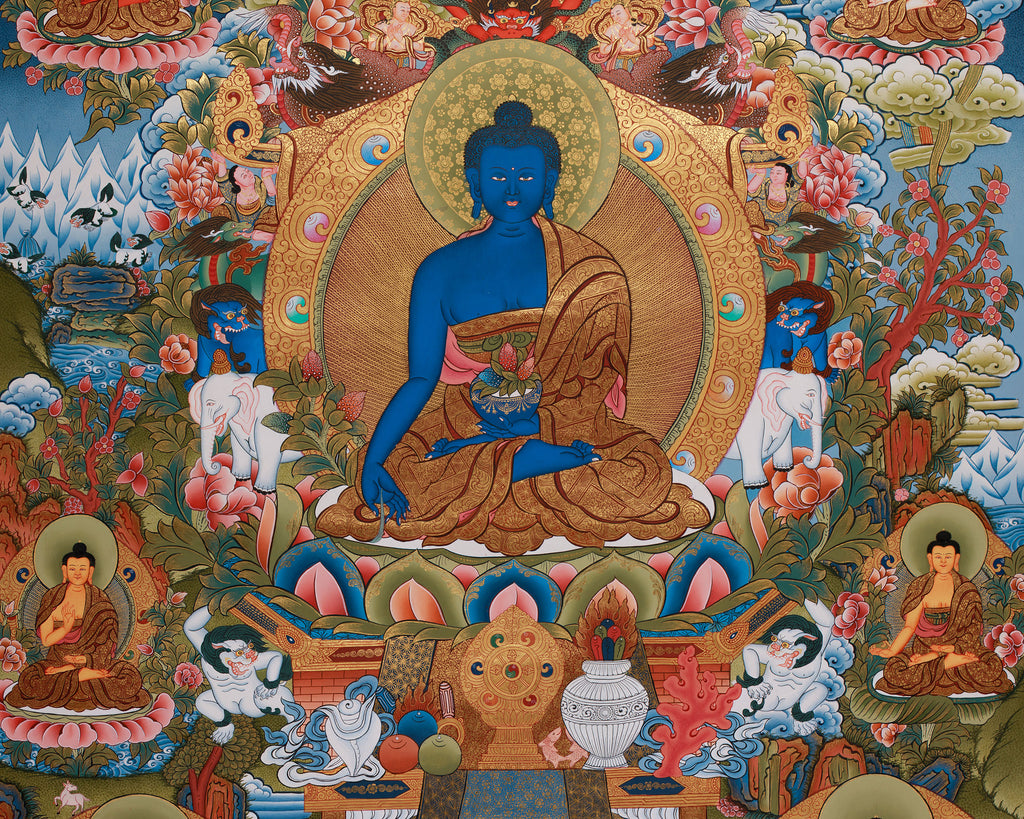 At the heart of the thangka is the central Medicine Buddha (Bhaisajyaguru) depicted in deep lapis blue, symbolizing healing, purification, and compassion. He sits in vajra posture on a moon disc and lotus throne, holding a branch of the myrobalan plant and a healing nectar bowl. His golden robe is adorned with gold outlines.