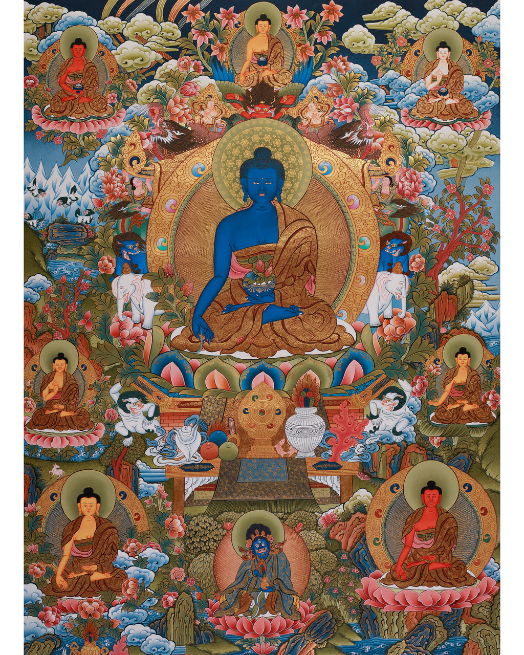 Surrounding him are seven other Medicine Buddhas, seated in balanced formation, painted in complementary colors, and holding a bowl symbolizing their commitment to healing and spiritual restoration. Their calm, meditative expressions bring a sense of peace and stillness to the composition.