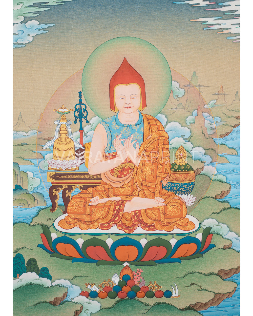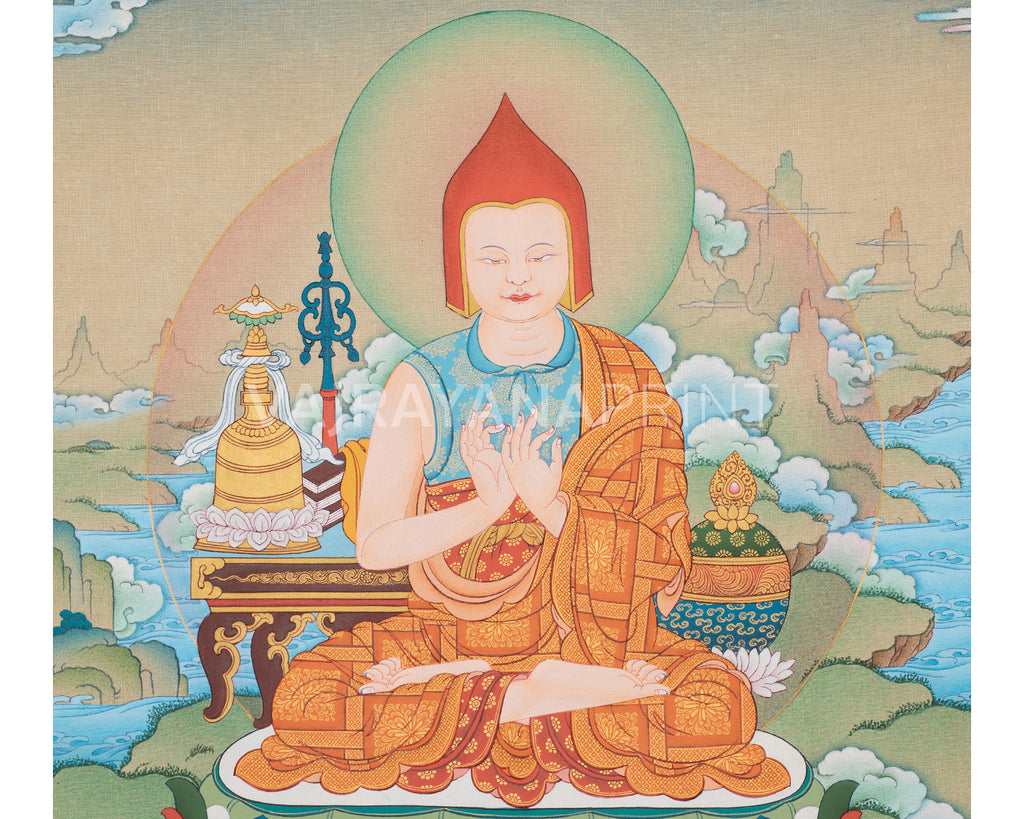 This thangka print depicts Atisha in a peaceful, meditative pose, surrounded by sacred objects, including the stupa and other Buddhist symbols. These elements emphasize his role as a teacher who guided many toward enlightenment. His calm expression and the sacred objects highlight his dedication to wisdom, compassion, and meditation, embodying his significant influence on Tibetan Buddhism.
