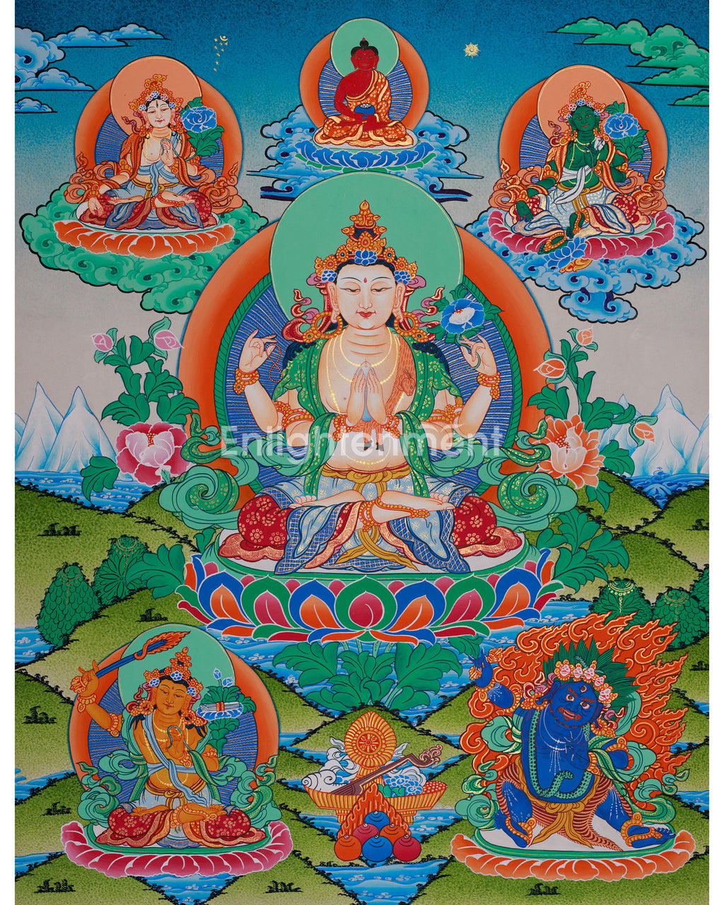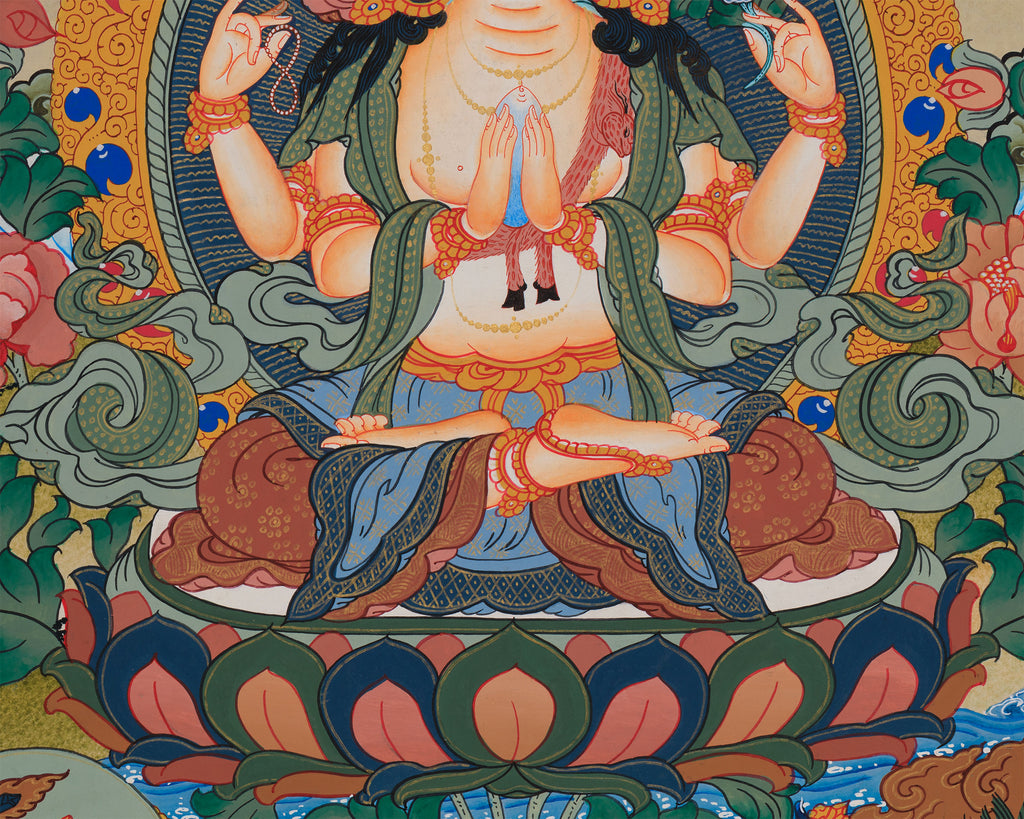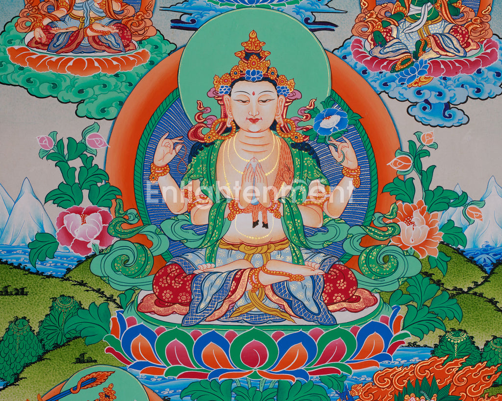 A gathering of enlightened beings encircles Four-Armed Chenrezig, the epitome of boundless compassion. Seated on a flourishing lotus throne, Chenrezig exudes tranquil compassion. His four arms represent his dedication to liberating all beings. Two hands hold a wish-fulfilling jewel, while the others grasp a crystal mala and a lotus flower.